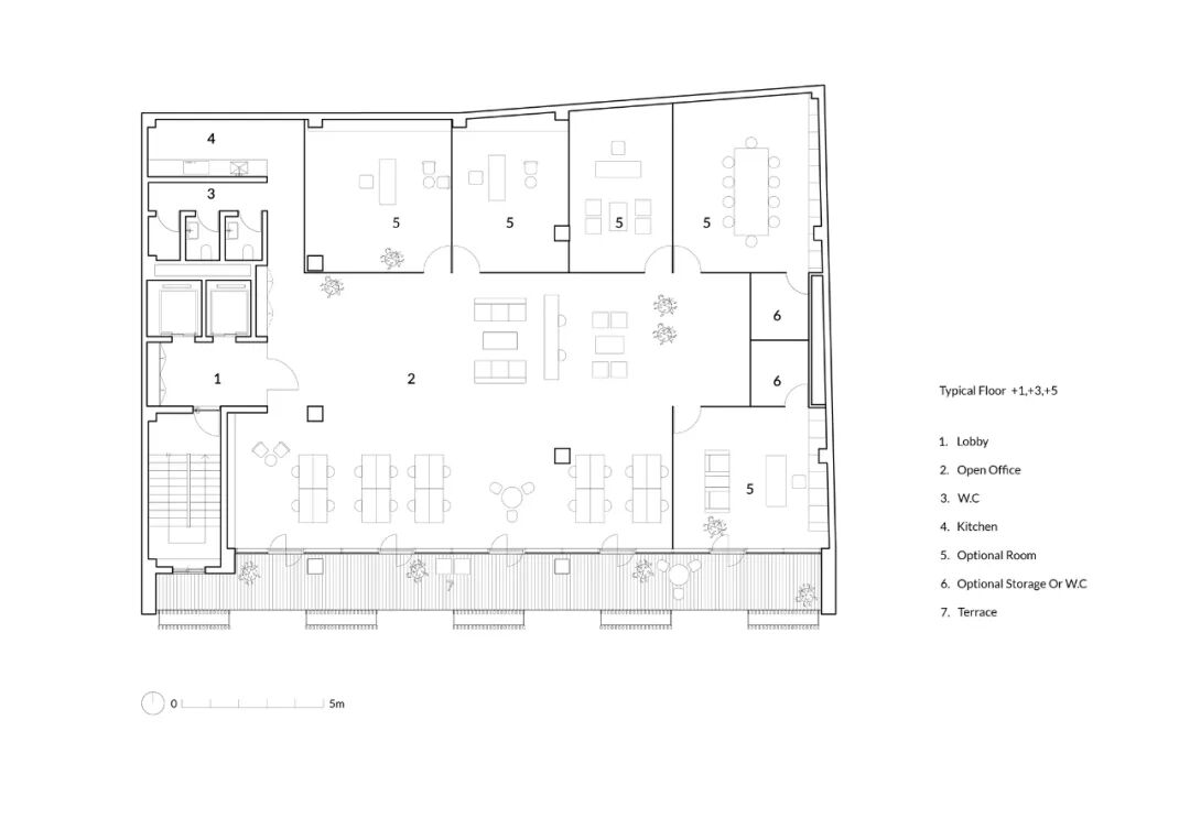 To achieve this, the boundary between the building and the city was defined by two distinct layers. The first, closer to the interior, consisted of large, transparent windows that allowed natural light to flood the space, enhancing visibility and openness. The second, external layer was semi-transparent, composed of wooden railings and steel planters, forming a permeable screen. This outer layer acted as a filter, regulating light and airflow while providing a sense of privacy for the occupants. The space between these two layers became an active zone—partially open, serving both functional and aesthetic purposes, and softening the transition between the building and its urban environment.