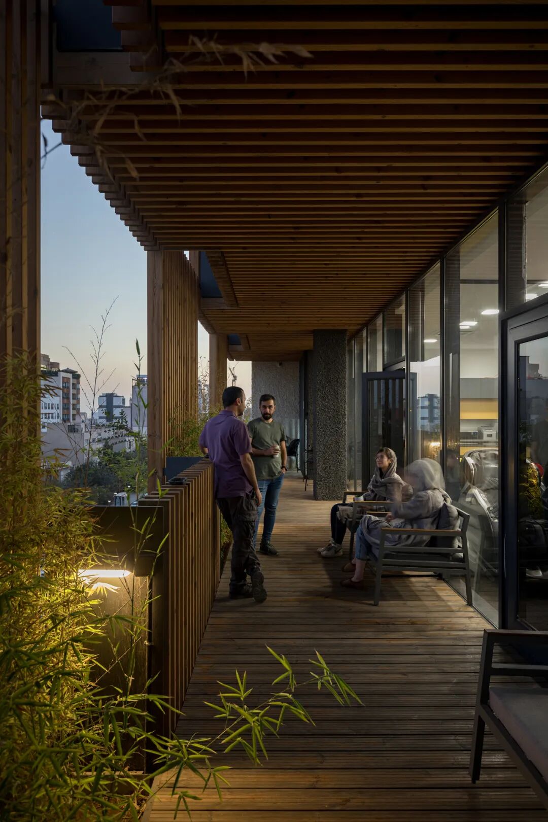 这种设计语言延伸到了屋顶,延续了分层透明和半透明的概念。屋顶不仅仅是一个功能性空间,而是建筑与城市互动的一个组成部分,既能提供景观、光线和空气,又能保持一定程度的隐蔽性。