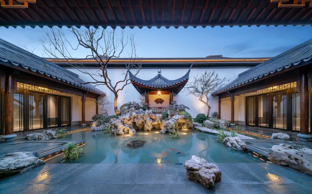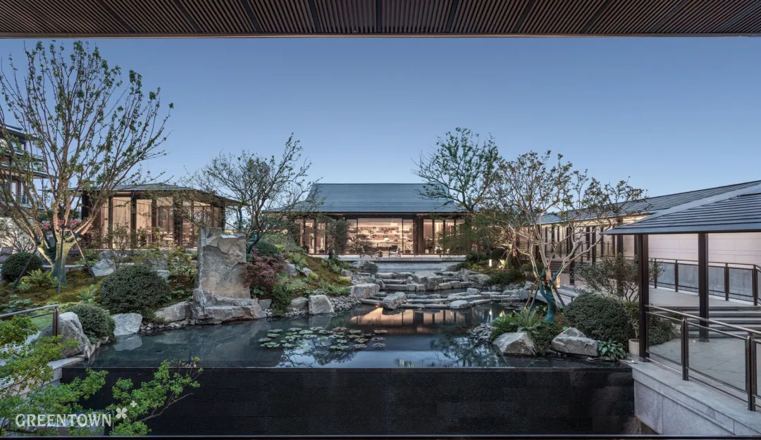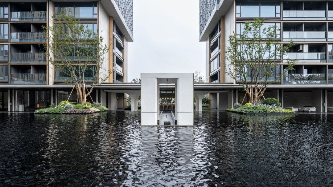 于城市中,坐山引水,以现代美学手法融合中式传统神韵,延续义乌山水胜景,堆山理水,筑造雅致水院。悬崖飞瀑,置石堆叠,清潭弥雾,莲叶吐苞,于闹市中构建立体山水画卷,勾勒当代东方雅韵。