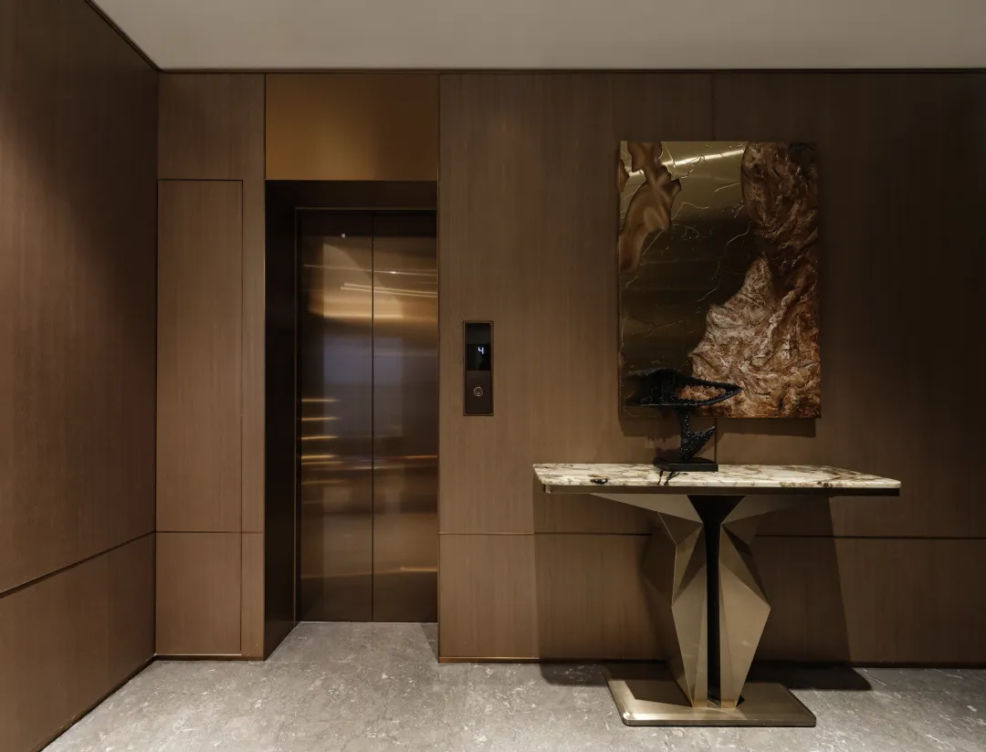入户门厅,复刻的是上海海鸥丽晶酒店。这样的海派风情玻璃窗格门,不仅在地面上的入户门厅,也在地下车库的归家门厅里。
