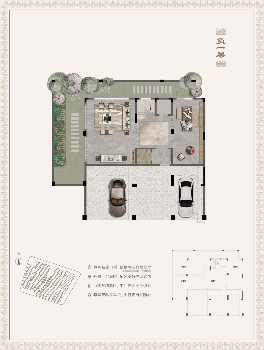 当世人执念于传统墅居归家没有隐私感时,【东润府】特别打造了独门独院的入户动线:下叠设置有下沉式独立归家庭院;所有户型皆以专属电梯直达,形成互不干扰的归家情境,优雅从容的生活日常大大提升了墅居仪式感。