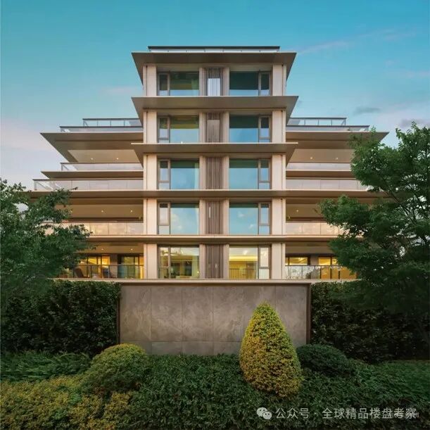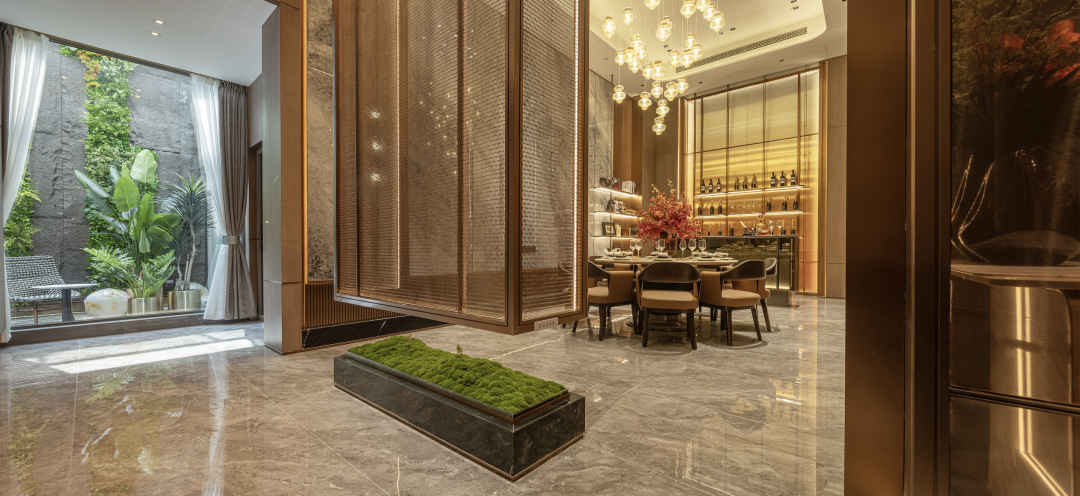 在项目入口的门头设计上,项目特别选用了普拉达绿奢石,为建筑增添了隐奢的气质,手工打造的铜门和格栅为业主归家增添高雅的仪式感。
