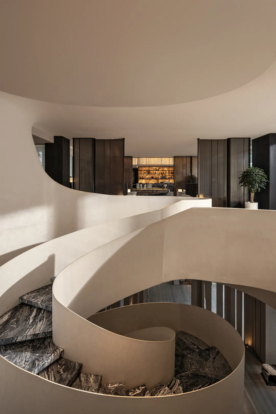 连会馆1楼的咨客台与旋转楼梯选用的都是市面上难得一见的国产奢石——冷翡翠,价格高达3万/㎡,属于用一块少一块的石材。