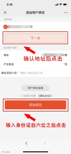 点击自助指导—用户绑定—输入用户证号—确定地址—输入身份证后6位—点击绑定。