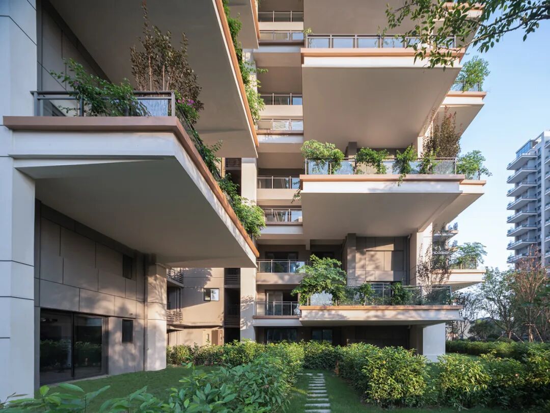 融旷·明亚·江山天悦,创新性地将垂直空间划分多个层次,采用“奇偶错层"、"前园后巷”等不同的绿化布局,形成空中花园景观。局部挑板的结构形式,解决下挂的结构梁系遮挡花园露台天然照明的可能。