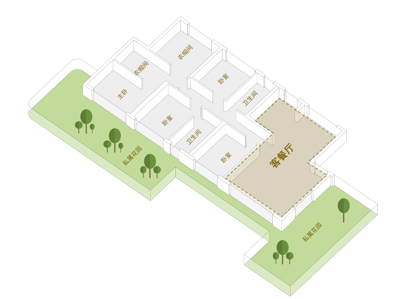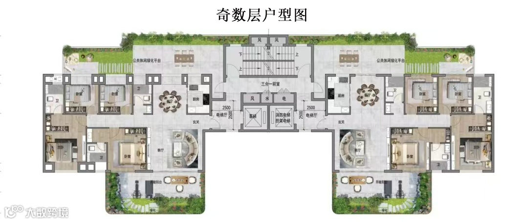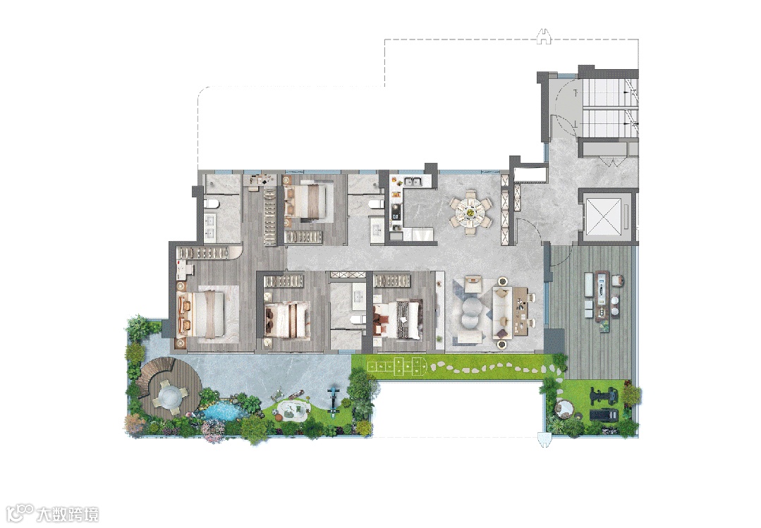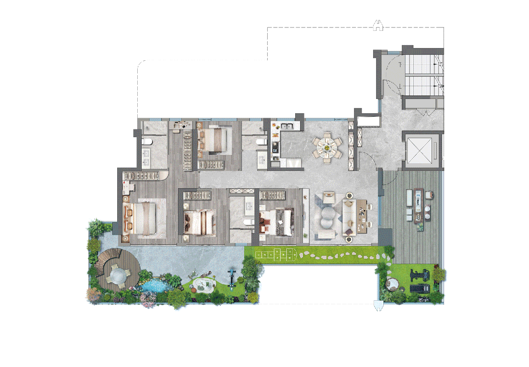 介于别墅单层面积小、大平层没有花园的痛点,眉山樾园打破别墅和平层的界限,这种端厅大平层+空中花园的组合,便成就了樾园的理想空间。