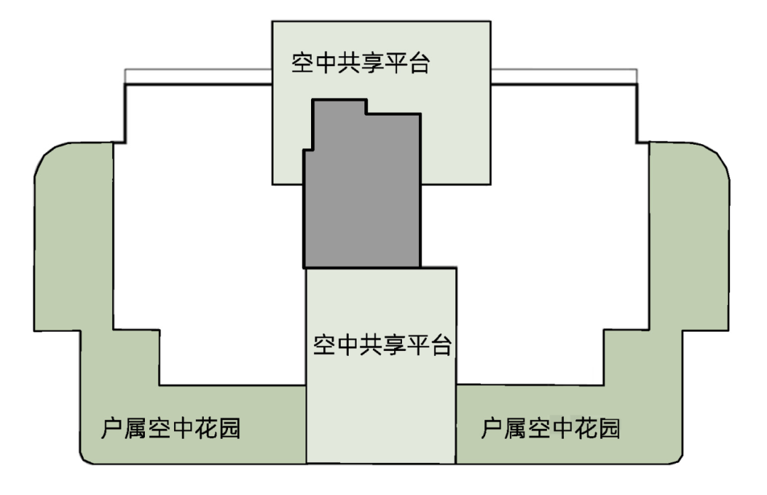 2、空中共享平台:应连接一定数量住户,高度不低于2层,沿开敬面应做绿化。空中共享平台不计容、不计产权,建筑面宽不受限制。