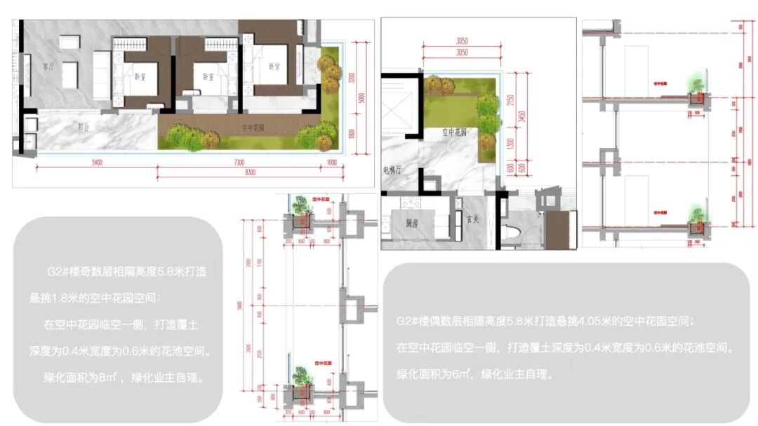 武汉城建金地和悦户型设置两层一露台,采用端户阳台错层挑高的方式,G2#楼栋采用卧室出挑和入户空中花园出挑两种布置方式,奇数层悬挑1.8m,在临空侧设同样尺度的花池空间,绿化占比52.5%;偶数层悬挑4.5m,设同样尺寸花池,绿化占比51.2%。