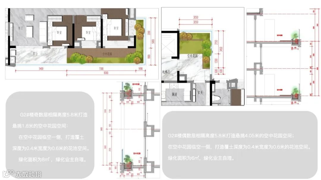 3、试点建筑每套住宅空中花园水平投影面积可突破原规范中的15%的限制,空中花园外挑尺寸应大于4米且小于6米;