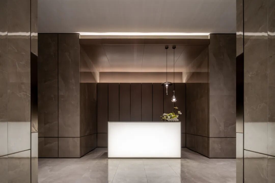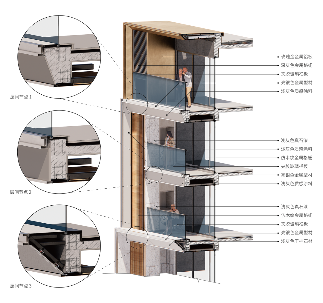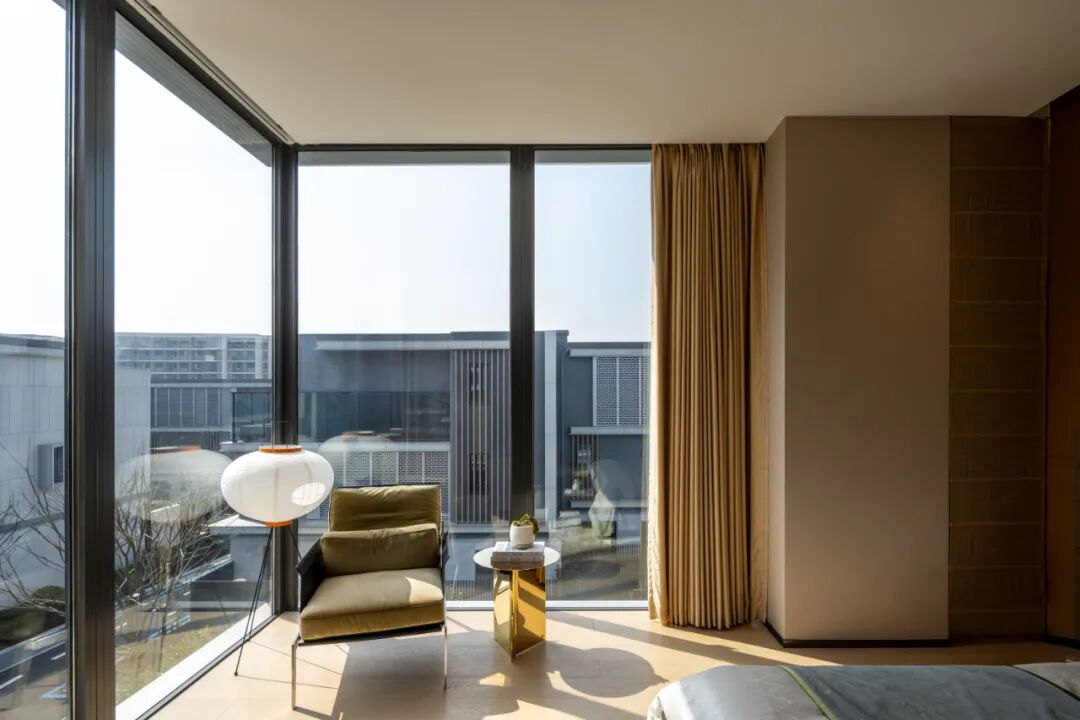 建筑崇尚自然璞拙,立面上运用了大面积落地玻璃、仿石漆涂料、金属型材等现代材料,简洁通透,进一步提升观山视野和互动空间。在光影变化作用下,明晰的体块关系与精致的材质细节,丰富建筑的现场感知。