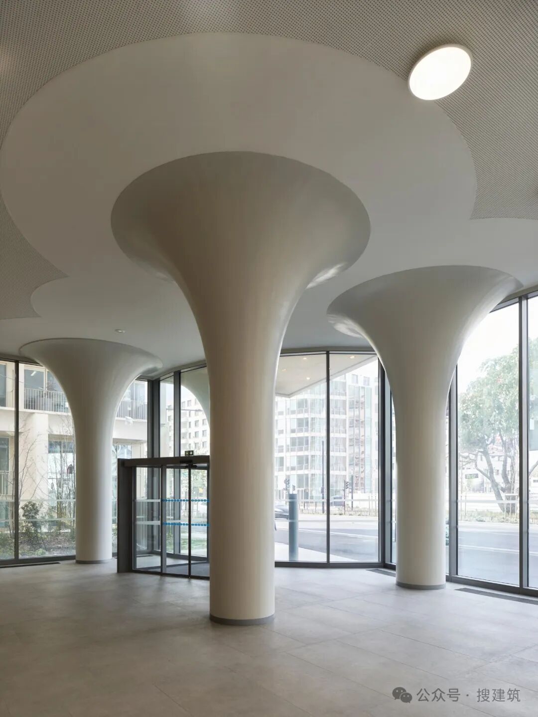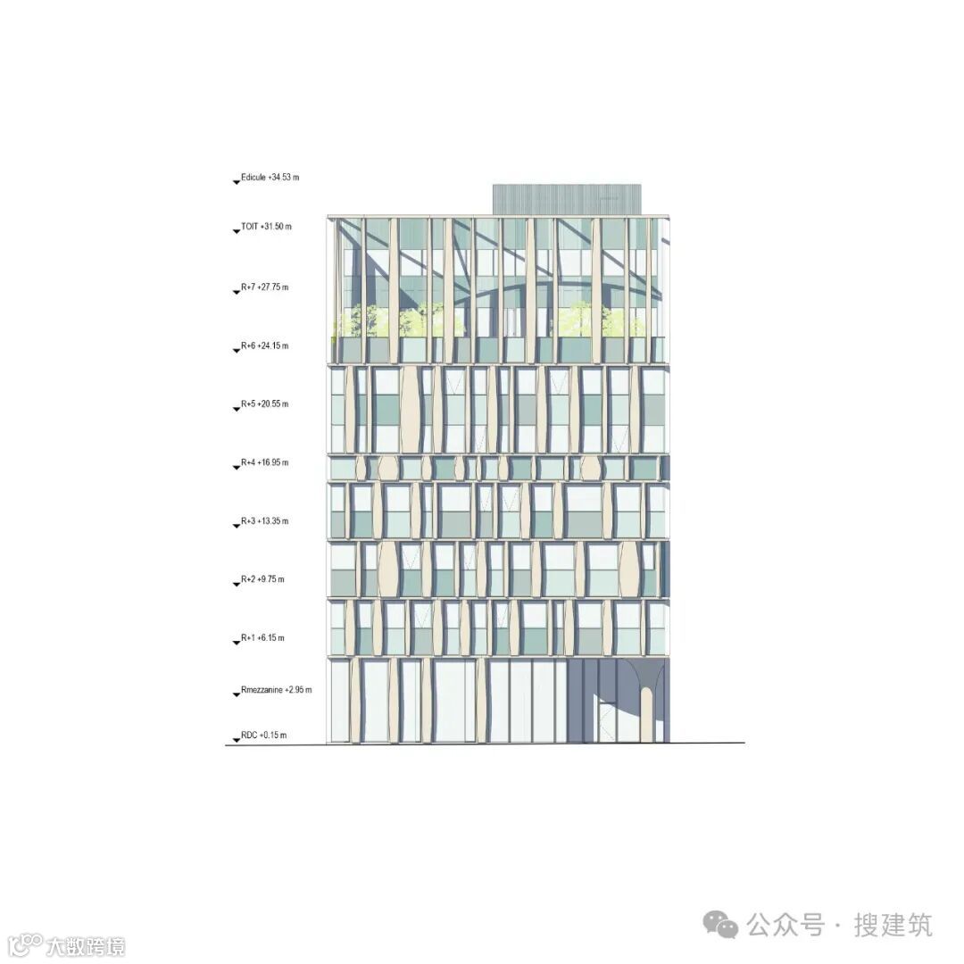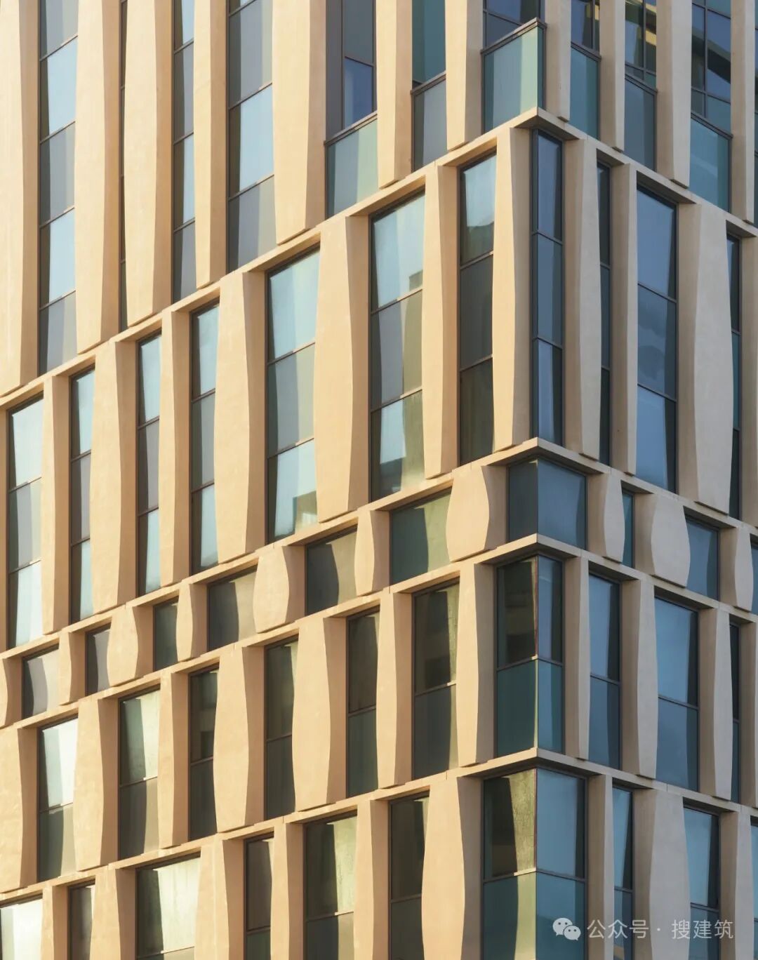 连续的外围 “表皮 ”将内部空间划分为几个层次,从而增加了层次感和强烈的光影效果:内墙交替使用带状窗带和不透明窗带,窗带表面使用阳极氧化铝遮阳元件,可根据天气条件作出反应。