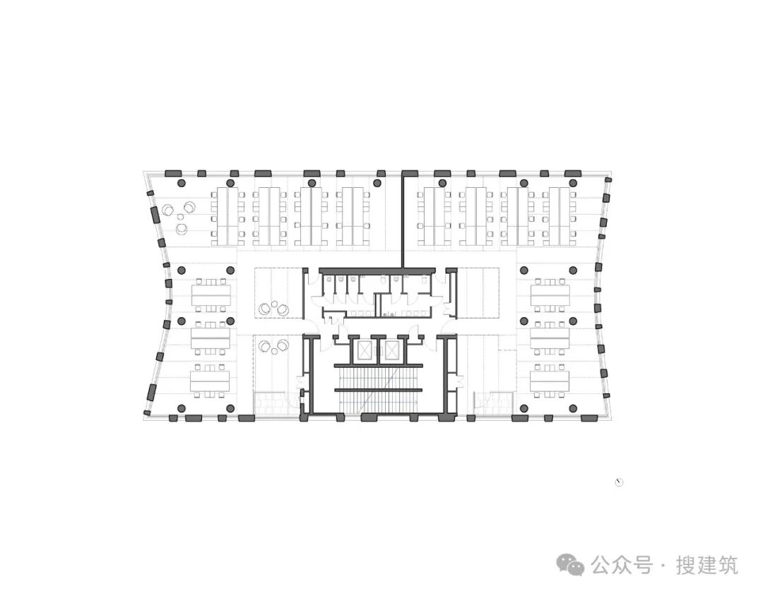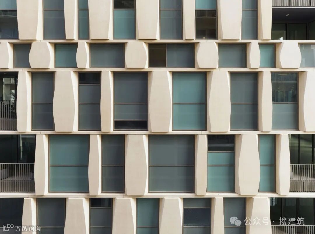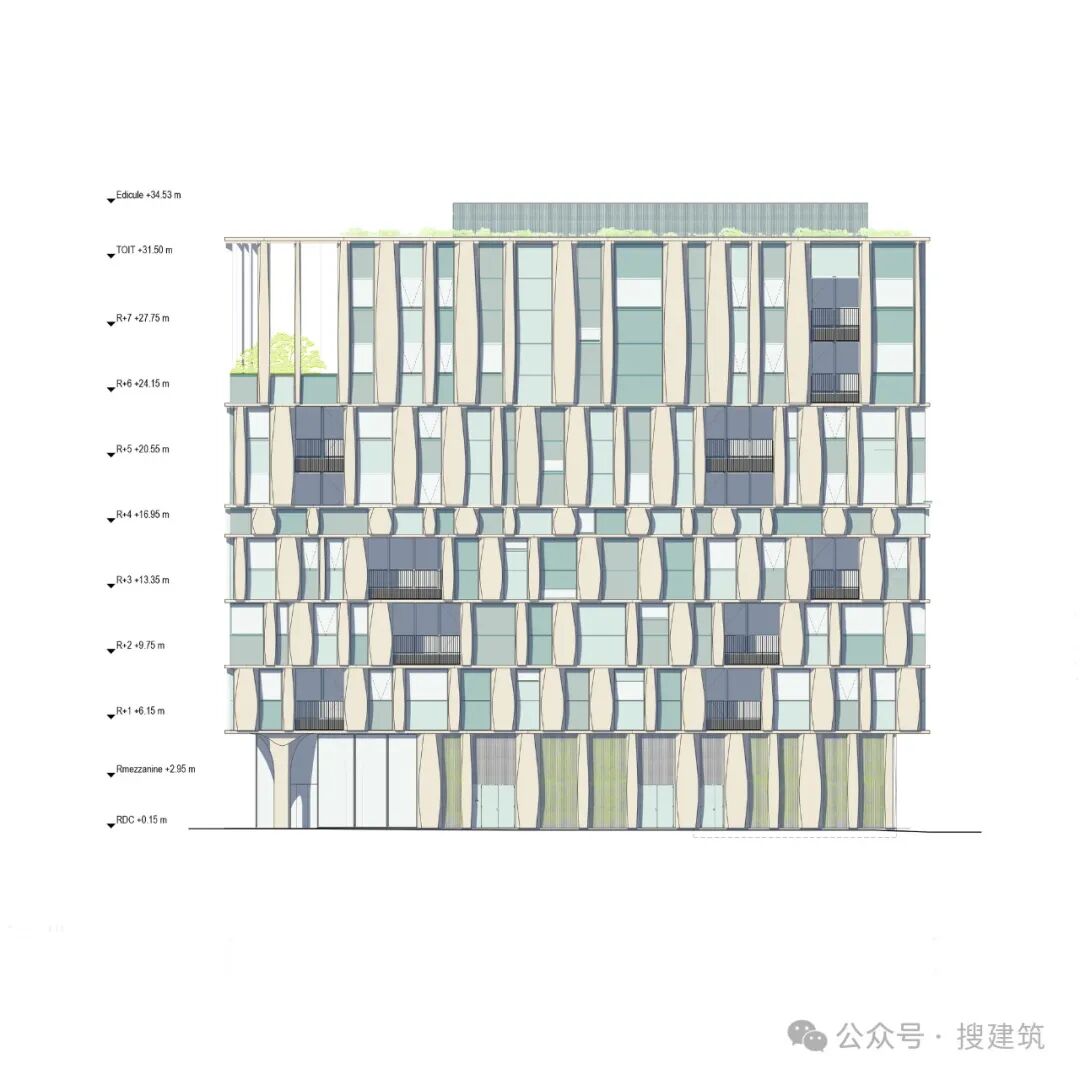 连续的外围 “表皮 ”将内部空间划分为几个层次,从而增加了层次感和强烈的光影效果:内墙交替使用带状窗带和不透明窗带,窗带表面使用阳极氧化铝遮阳元件,可根据天气条件作出反应。