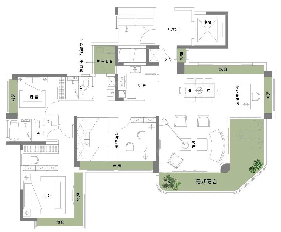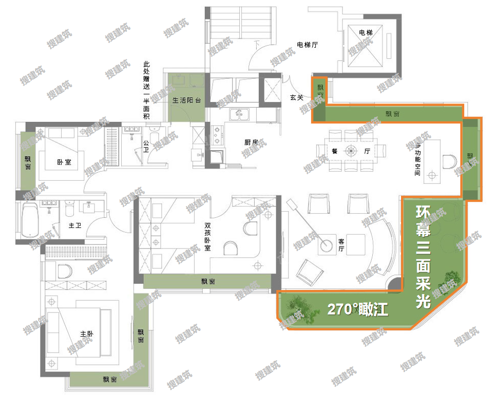 公区实现了超强大的三面采光,环幕大面积采光,打破空间界限,实现270°瞰江。餐厅超大飘窗与客厅观景阳台实现南北对流,让整个公共空间清爽明亮。