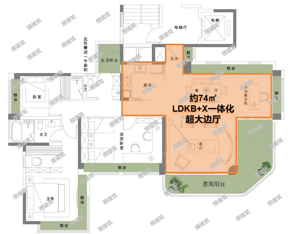 其中“LDKB+X ”超大边厅,形成约74㎡的超大社交空间,满足家庭聚会、商务私宴等多种场景。“X”空间,可以作为书房或茶室,享受一方静谧和安逸。