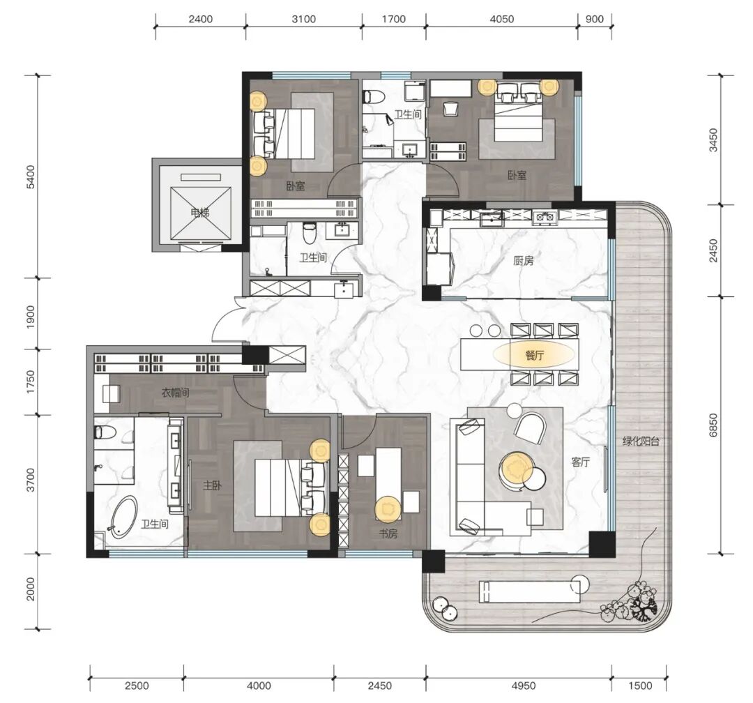 大平层虽然在空间形式上,更容易让人产生互动和交流,但并不意味着每个人都因此失去了独立的生活空间,建面约175㎡的户型做到了4房双套间设计,进一步可全家交流,退一步可互不干扰,可以满足各类功能所需,让居住者更自在、更便捷。