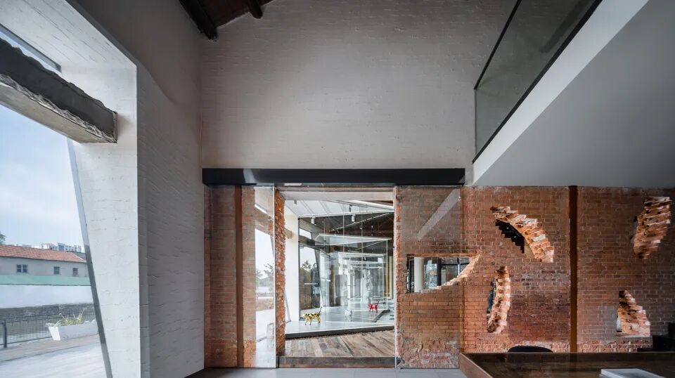 项目设计基于场地环境及当代艺术的属性,摒除原始建筑多余的形体,以恰当的分寸,极简的手法,再造出通透性及关联的几何形态,让建筑与室内融合在一起。
