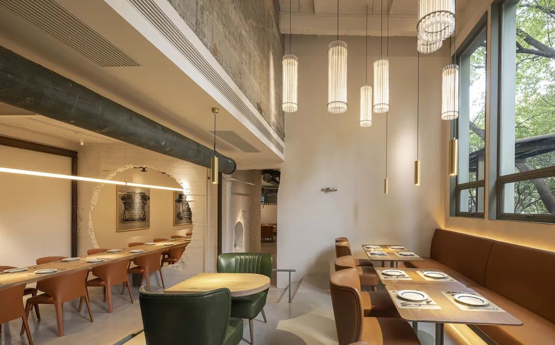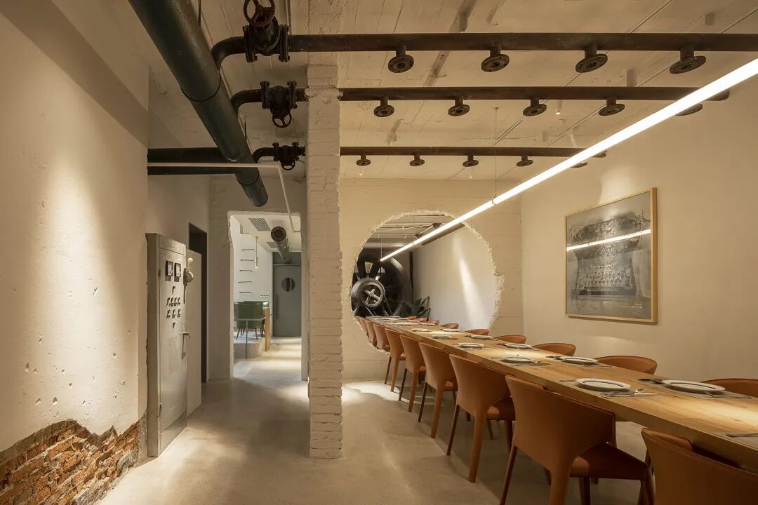 从大厅前往就餐B区,会看见许多巨型风管,设计中将它们悉数保留,仪表柜矗立在原始角落,生锈的阀门、斑驳的墙面、脱落的按钮,处处显现出工业时期的粗犷与硬朗,与精致的餐具菜品形成强烈的碰撞。