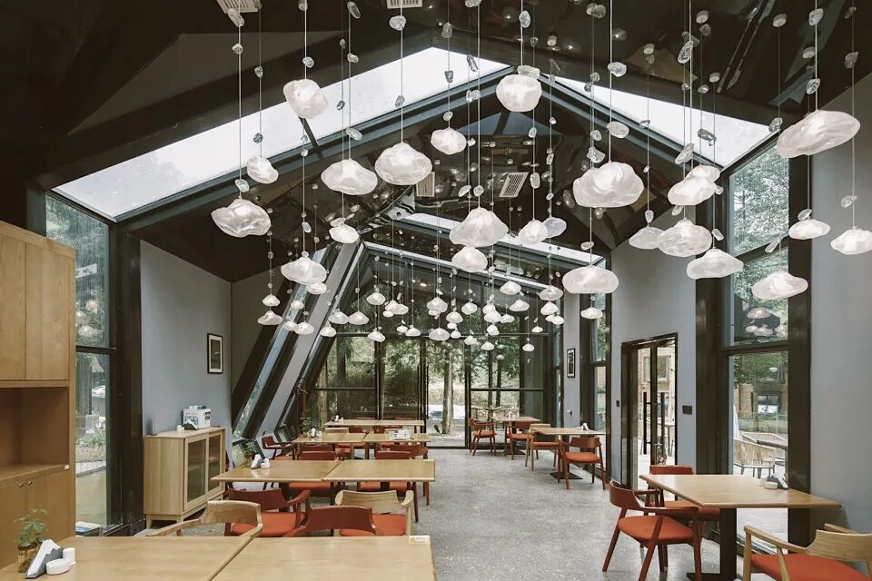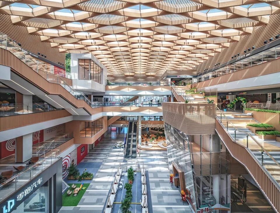 在与建筑设计团队密切合作下,中庭天花造型采用菱形阵列布置,通透的玻璃让自然光线散射室内,拉近人与自然的距离。