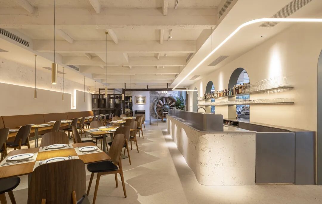 穿过咖啡区进入大厅,吧台向内延伸,正好环岛一圈形成用餐区的水吧,一条矩形灯带在顶部环绕。墙面选用白色不规则几何块状装饰,与老厂房的斑驳墙面形成新旧对比和反差。
