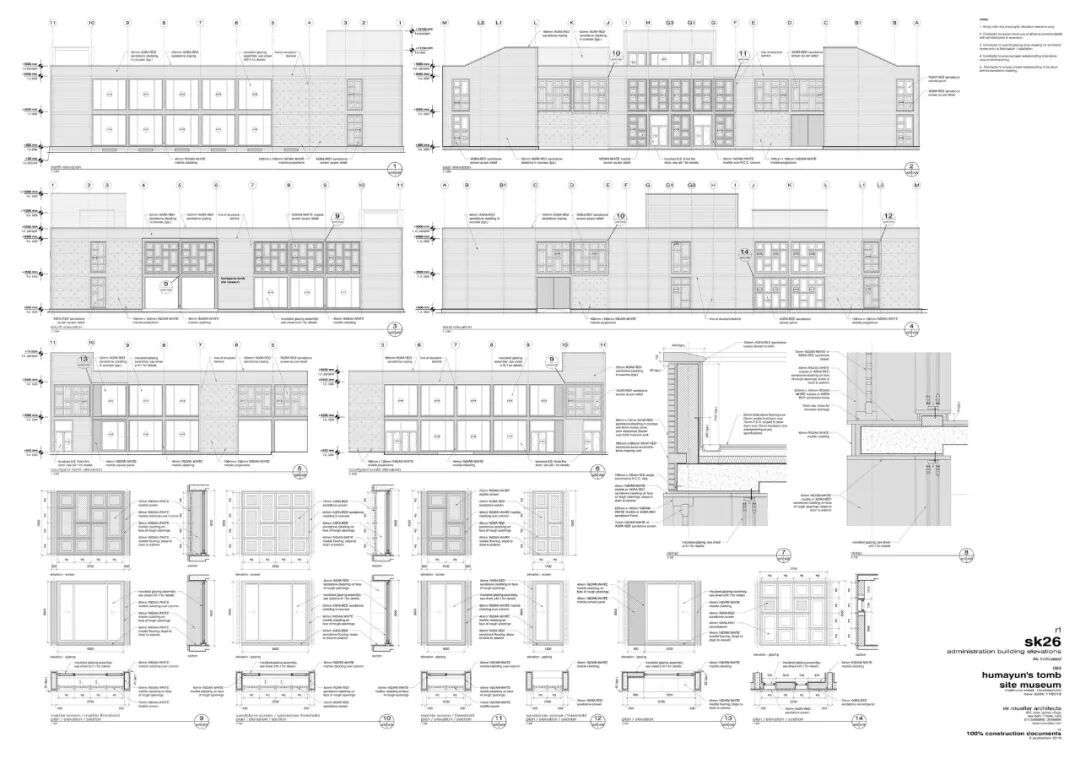 The gallery spaces for the Humayunís Tomb Site Museum are arranged in a sequence of intersecting squares, with wide column spans of eight meters to enable curatorial flexibility for exhibit design. Given the increased traffic of visitors expected at the site, the public circulation sequence has been organized along a primary axis, spanning the entire length of the Museum. Natural light, filtered through skylights and open courtyards, illuminates the galleries. These open courtyards are critical aspects of the gallery, enabling curated displays of Mughal architectural artifacts, including faÁade treatments, landscape elements, and ornamental traditions. Complex engineering systems required for a modern museum are woven around each gallery through dedicated service corridors, thus facilitating optimal curatorial and museum management protocols. Mughal emperors and their architects accorded great worth to the relationship between form, space and material. Their mastery lay in achieving a delicate balance between boldly proportioned exterior mass, and lyrical sculpting of interior volumes. In their use of stone masonry to sculpt the forms of their mausoleums, the Mughals conveyed an impression of permanence that characterizes their architecture. Thus, the monuments of the past remain contemporary simply by evoking a sense of timelessness. The Site Museum aspires to a similar sensibility in the visitor experience.