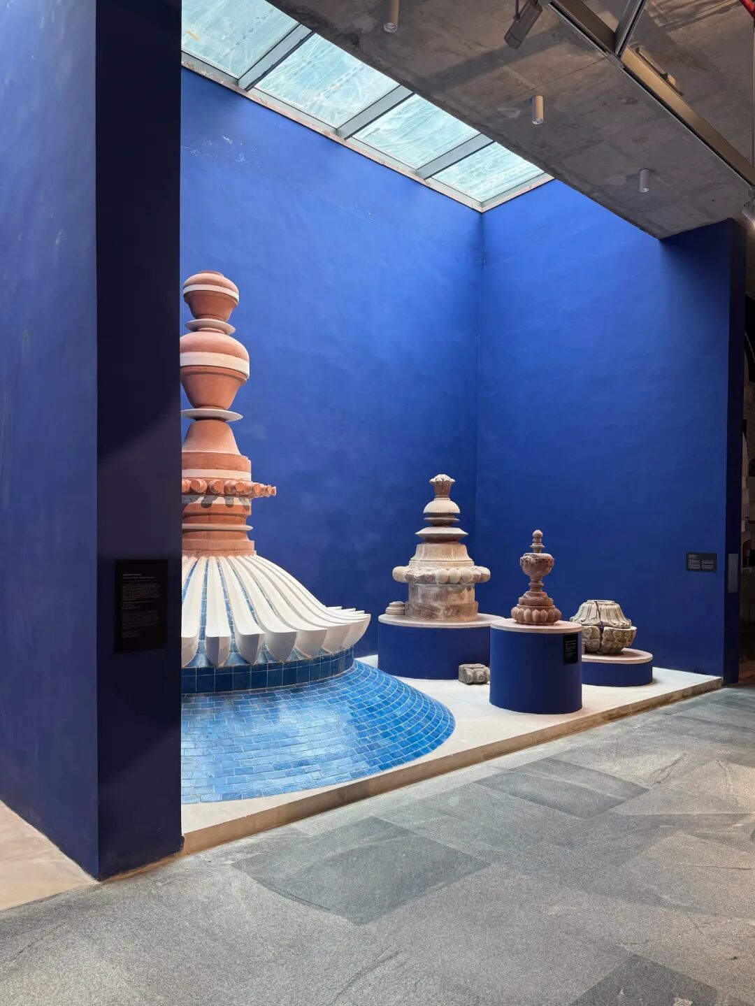 毗邻永久展厅的顶饰展厅将展出修复后的胡马雍陵铜质顶饰,以及 1997 年以来在胡马雍陵建筑群保护工作中发现的其他原始建筑元素。铜顶饰展厅通向第二个前厅展厅,该展厅位于巽他苗圃长廊的中轴线上。这个空间以其中心的一根柱子为标志,提供了通往胡马雍陵或通往巽他苗圃的选择。在每种情况下,游客从地下到地面的重新出现在空间上都是截然不同的。通往孙达尔苗圃的长廊和坡道采用了莫卧儿王朝珍视的主题--水的建筑。当游客从门厅长廊出来时,水的气息和声音扑面而来。当他们登上孙达尔苗圃的凉亭时,一个扇形喷泉(ëchinikhanaí)为他们进入园林领域提供了一个凉爽而受欢迎的门槛。对于前往胡马雍陵的游客来说,在大树树冠下雕刻的长庭斜坡花园是进入胡马雍陵围墙院落的出口。
