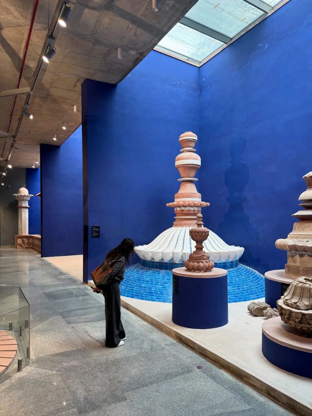 挑高的常设展厅室内面积超过 1000 平方米,是整个博物馆中最大的单一展厅空间。展厅北墙两侧是一个宽阔的庭院,光线洒满大理石地面和墙壁。庭院的地面铺设了彩色釉面砖,让人联想起莫卧儿王朝时期纪念碑上的花卉图案。庭院中的石砌凹室将展示重建的大 Nizamuddin 地区古迹和景观的重要建筑元素。常设展厅的南墙有四个天窗壁龛,每个壁龛宽 4 米,高 6 米。这些壁龛可以让策展人在自然光下展示大型展品,同时保护它们不受天气/外部/环境的影响。由于地板面积较大,头顶的天窗将过滤后的光线漫射到抛光的大理石地板上。这种微妙的光影效果照亮了整个空间,并反射到上方褶皱天花板的灰泥上,形成几何印记。