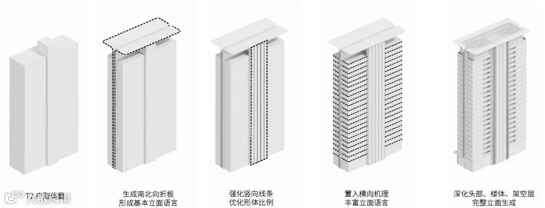 以“轻、薄、平”为核心,通过南北向折板设计,将建筑更大化的进行视觉压缩,削弱建筑体量感。同时竖向线条强调建筑的挺拔感,横向线条拉伸了立面视觉感。