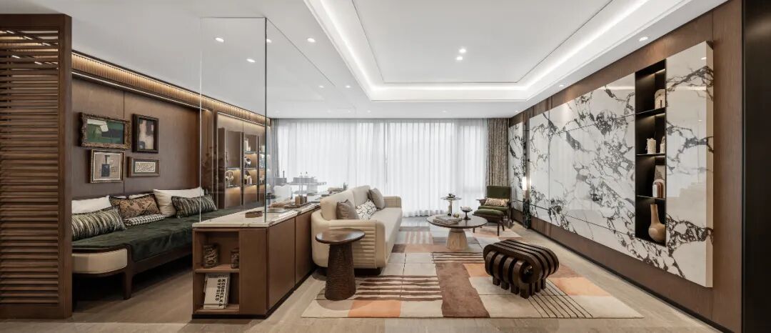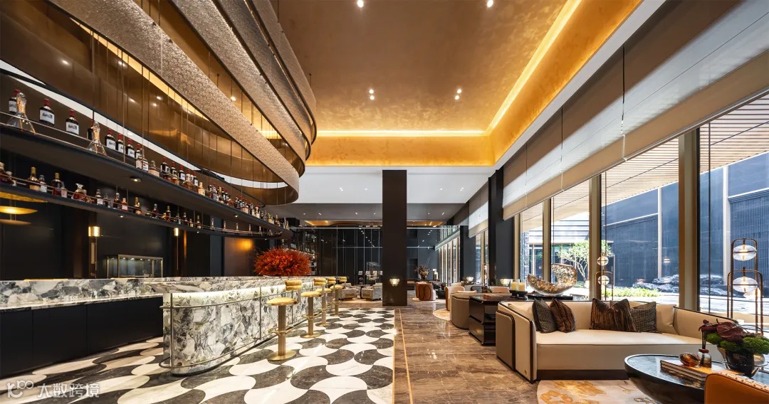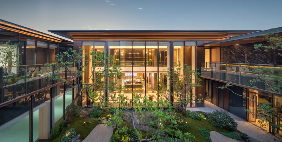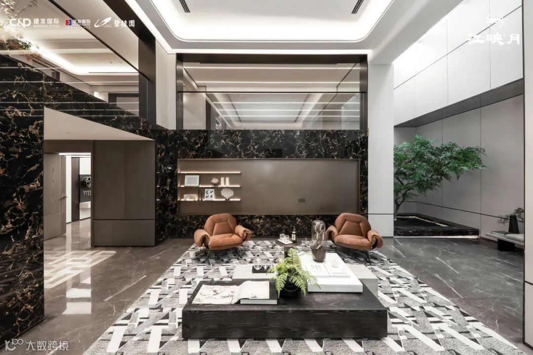 同时会所的挑高区域采用了长达10米的落地玻璃窗,整体营造了一个被园林美景包围的城市会客区。