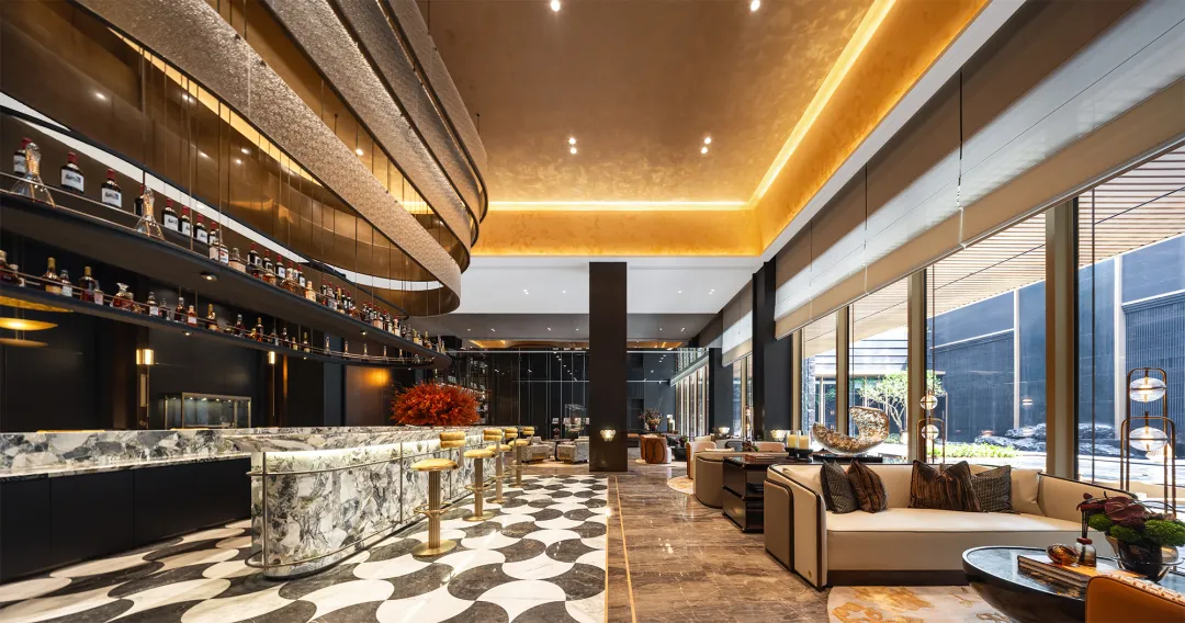 在会馆入口,项目借10米地势高差,设计飞流叠瀑的景观,其间绿色奢石与黑山密石,经非遗匠人手工打磨,映照于潺潺水流,形成一副自然画卷,远观可赏,近观可听。