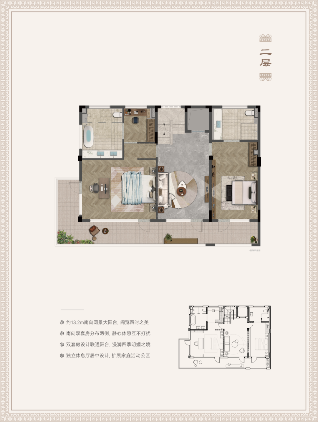 华润·孝子祠澐璟不是简单地加大加宽露台,而是把大露台的横向排布变成纵向嵌入,让超大露台嵌入到户型空间之中,它就改变了户型的传统结构,让客厅、卧室与空中庭院交融在一起,打破了室内外空间的边界,拥有了不多的「室内外交融」。