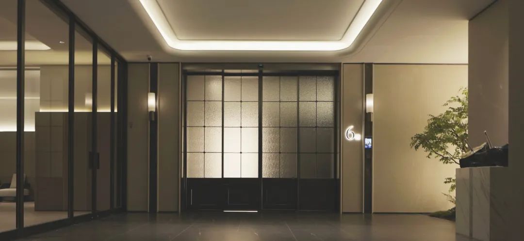 入户门厅,复刻的是上海海鸥丽晶酒店。这样的海派风情玻璃窗格门,不仅在地面上的入户门厅,也在地下车库的归家门厅里。