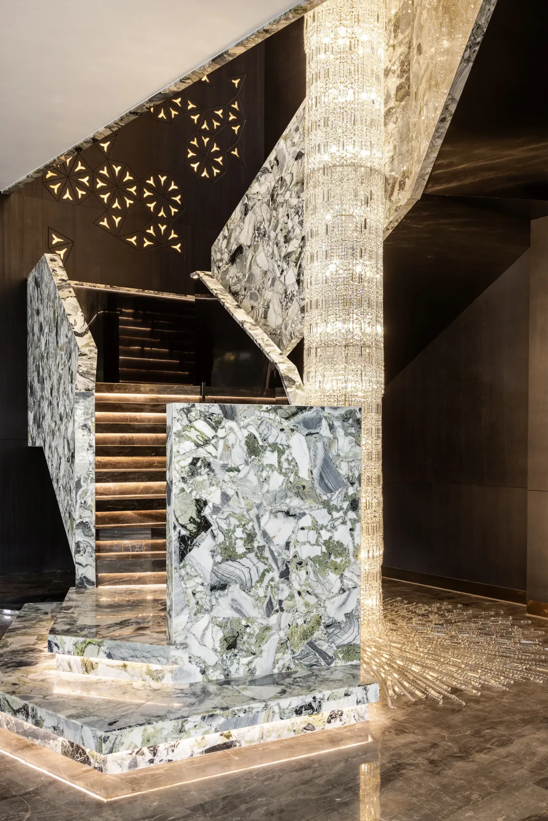 连会馆1楼的咨客台与旋转楼梯选用的都是市面上难得一见的国产奢石——冷翡翠,价格高达3万/㎡,属于用一块少一块的石材。
