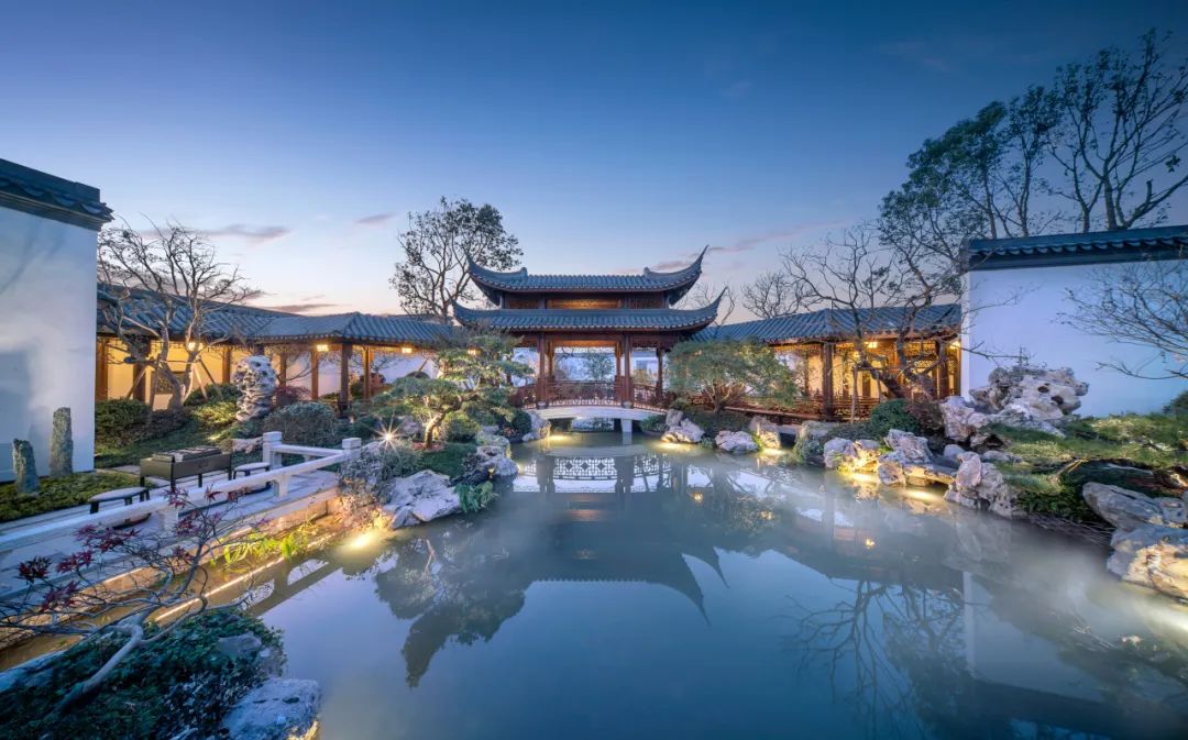 于城市中,坐山引水,以现代美学手法融合中式传统神韵,延续义乌山水胜景,堆山理水,筑造雅致水院。悬崖飞瀑,置石堆叠,清潭弥雾,莲叶吐苞,于闹市中构建立体山水画卷,勾勒当代东方雅韵。
