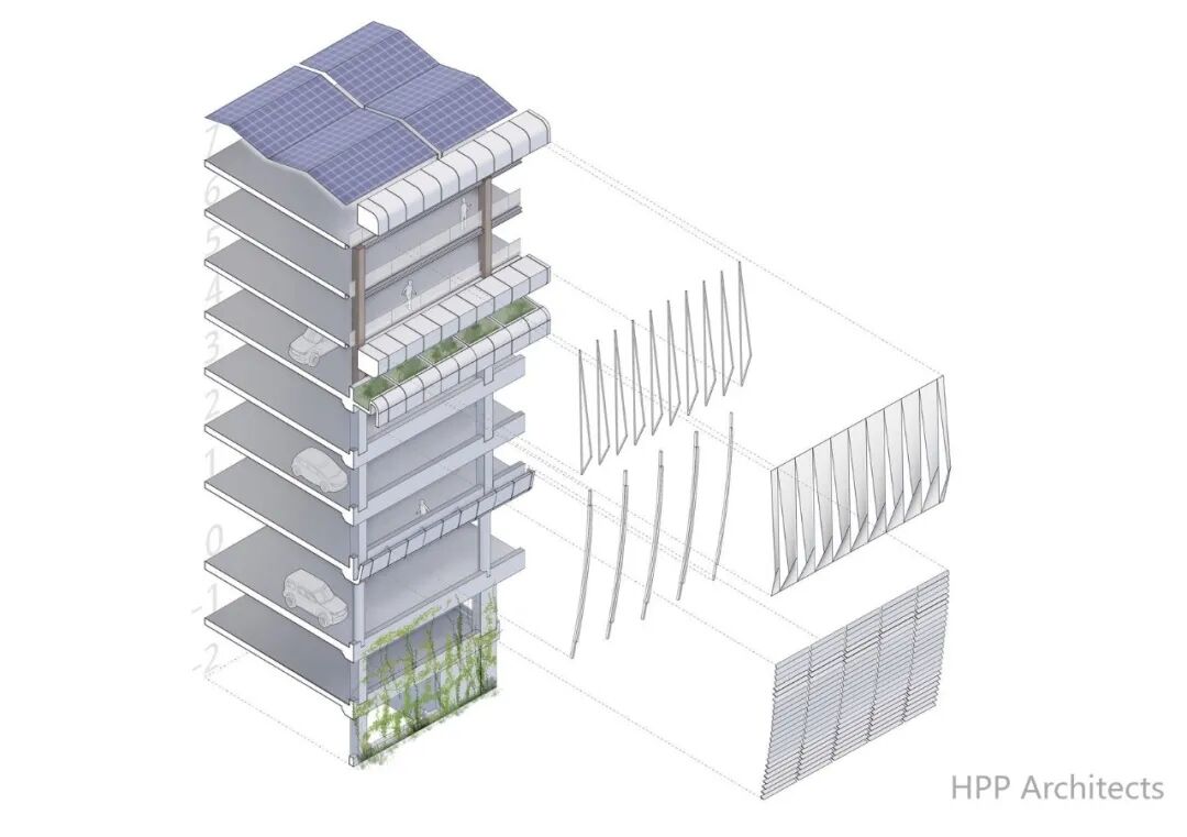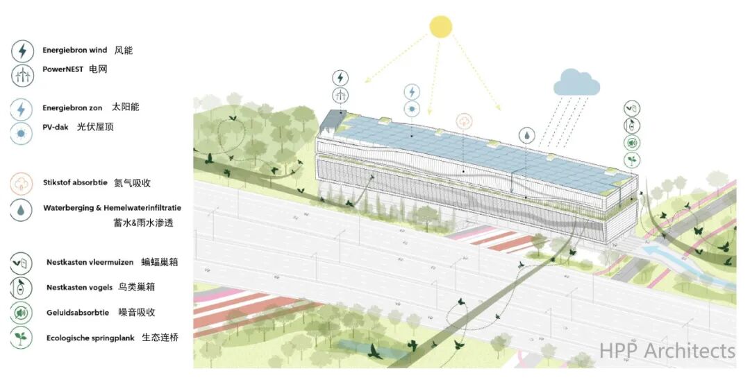 方案基于整体化可持续设计理念:种植区创造出蓄水空间,有效减少噪音,太阳能板及风力涡轮机则确保了能源中和。同时遵循城市采矿原则(指从大量的手机和电脑等废旧电器中,回收有价值的金属和矿产品),采用来自当地废弃建筑物的钢材,进一步减少生态足迹。