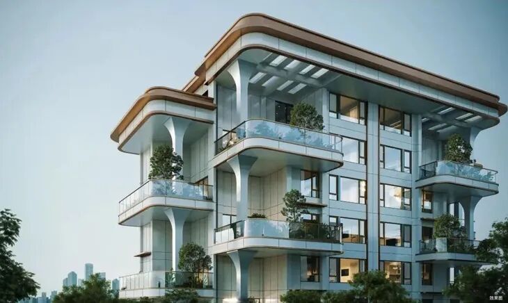 立面已有部分呈现,外挑的金色门檐、隽永的深灰底、银白+香槟金的弧形腰线,那枚「鎏金花瓣」镶了一圈深蓝色晶莹剔透的「花边」,自平面中撑开新天地。