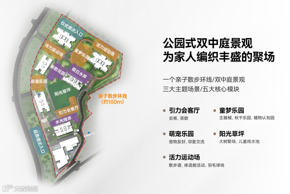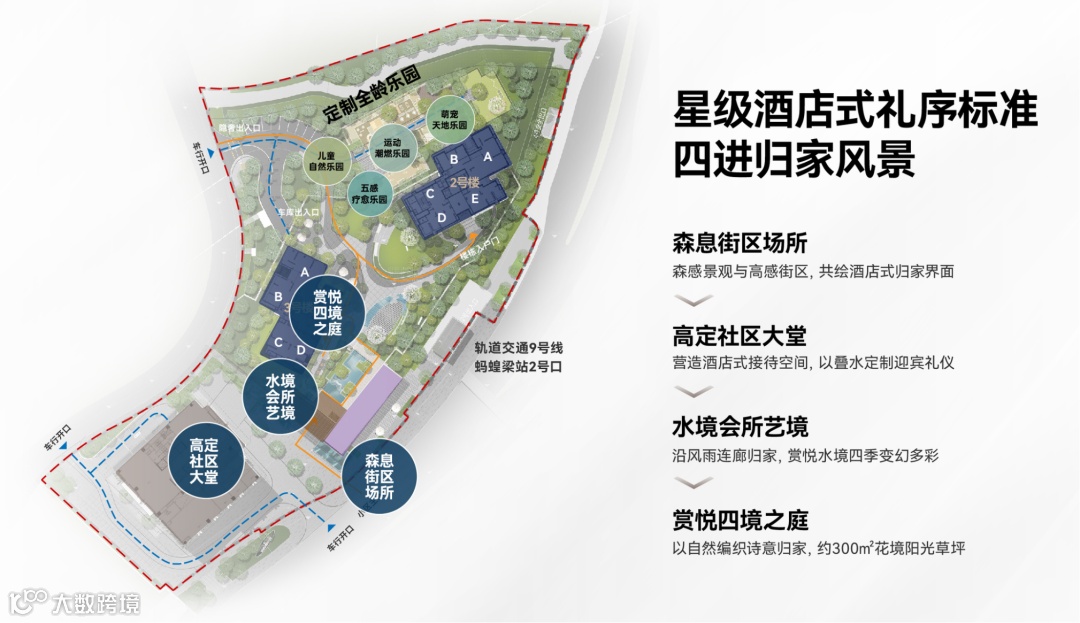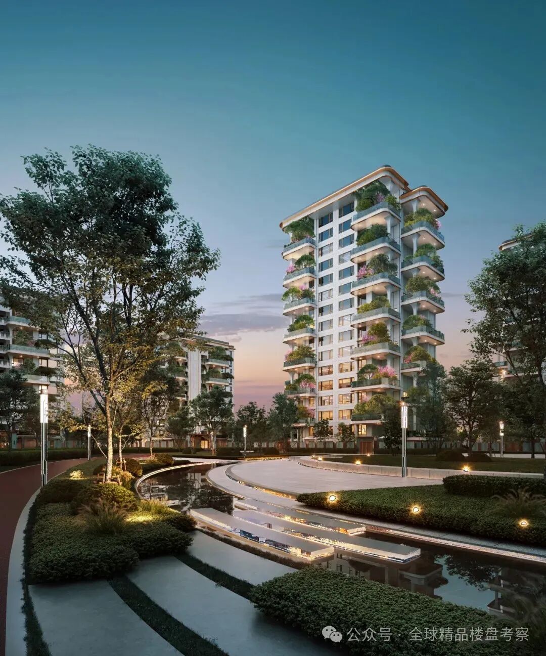 星级酒店式礼序标准四进归家风景;森息街区场所:森感景观与高感街区,共绘酒店式归家界面;高定社区大堂:营造酒店式接待空间,以叠水定制迎宾礼仪;水境会所艺境:沿风雨连廊归家,赏悦水境四季变幻多彩;赏悦四境之庭:以自然编织诗意归家,约300㎡花境阳光草坪。