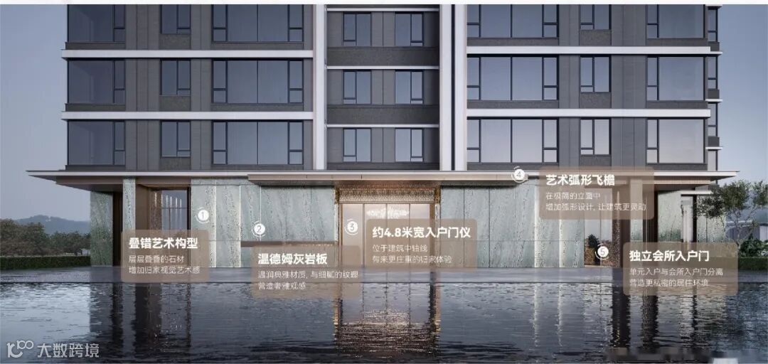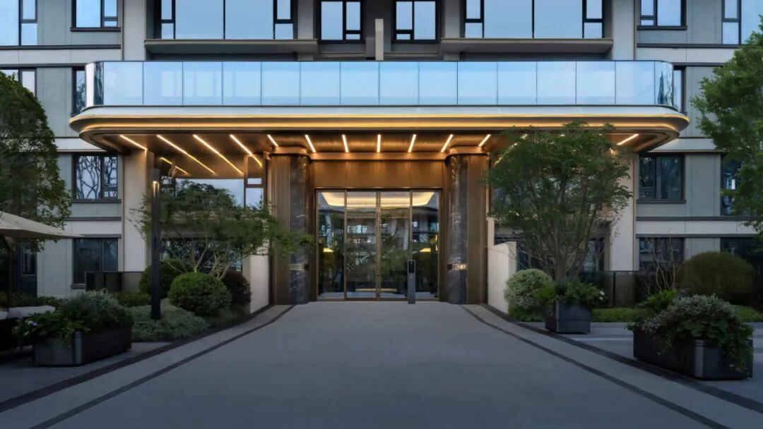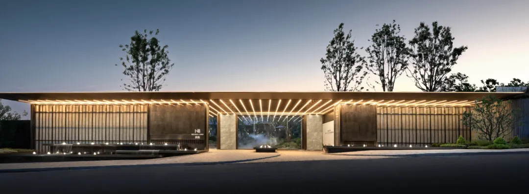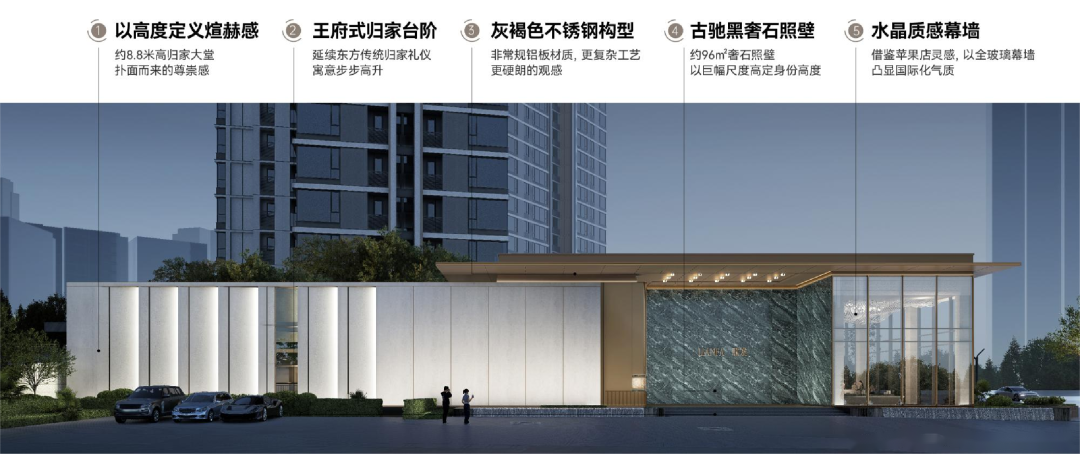 约56米宽,恢弘界面;致敬世界建筑大师密斯凡德罗经典作品“德国馆”,以“less is more”的现代主义建筑理念,历经10余次设计打磨,营造简练且精致的国际化归家界面。