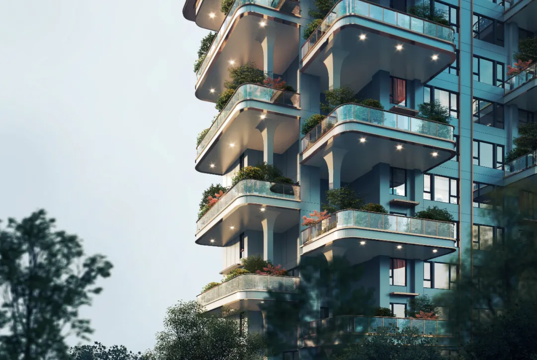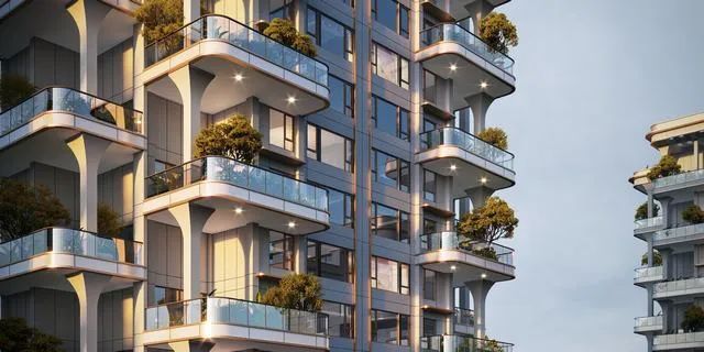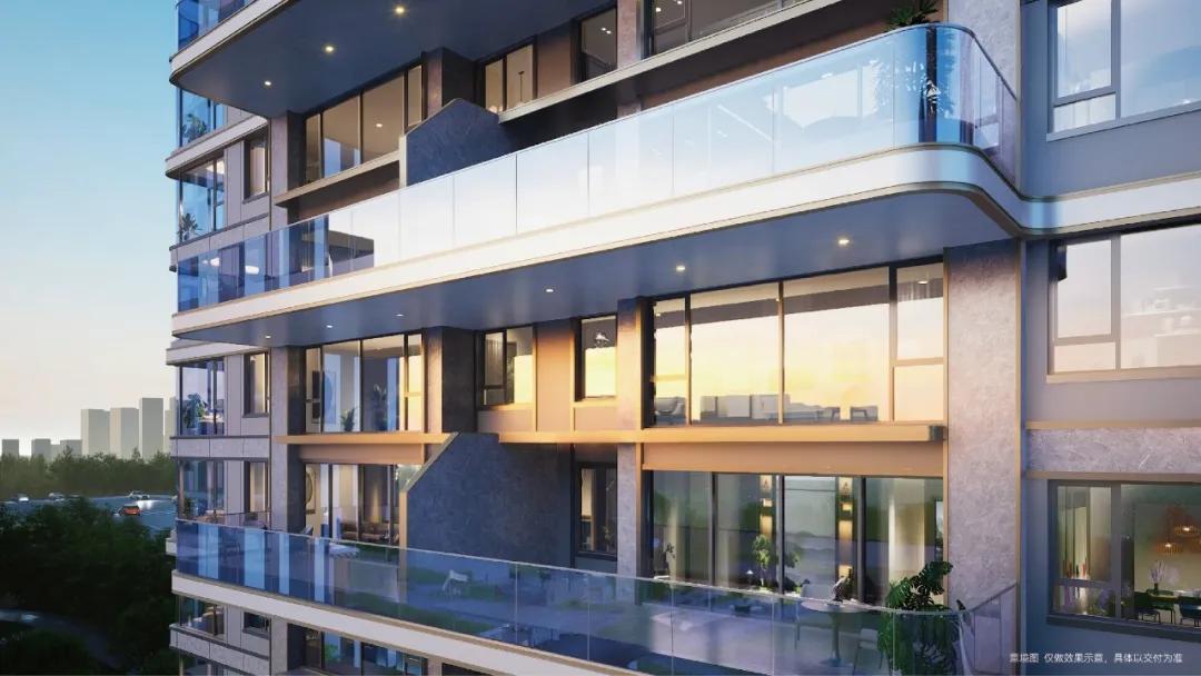 项目建筑外立面局部呈现,以大气优雅的建筑形体比例、弧形线条展现了几何美学精髓。0.31的窗地比、大面积的玻璃、曲角阳台等创新设计,营造通透敞亮的采光效果,赋予建筑独特精神韵味,领衔人居进阶风潮。