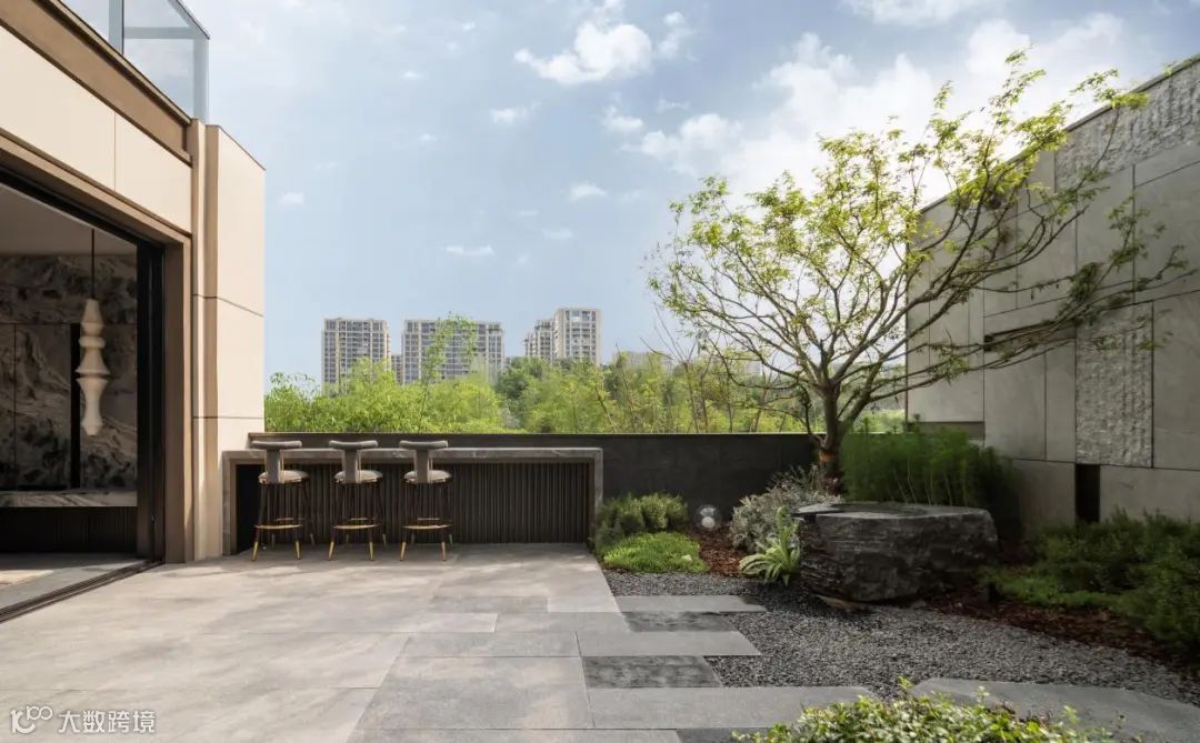 落地高窗后,会有一座约6米高差的立体无界山水艺术庭院扑面而来。溪瀑在切割如钻石的石头上蜿蜒而下,让整个蓊郁苍翠的庭院产生了禅意。