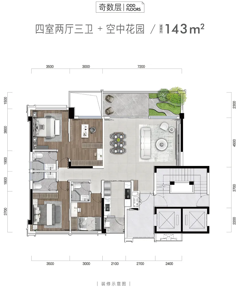 N11主要供给两个面积段:建面约141㎡和建面约179㎡,各自因奇偶层变化,产生花园和室内结构的些微变动。