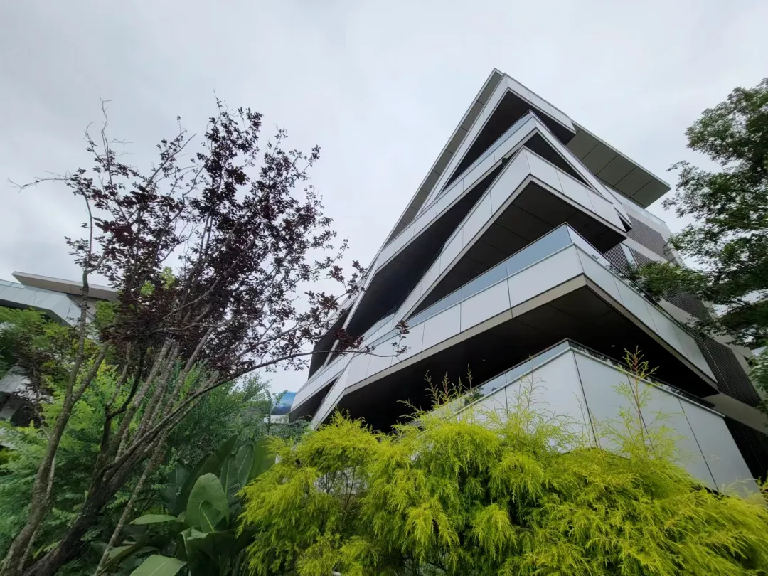 设计团队将重庆连绵起伏的山形地貌,抽象为波浪折线立面,产生跌宕起伏的立体感,构建出了流动在建筑上的现代山水。白色的立面象征重庆的薄雾漂浮;80%的金属铝板材质,配上玻璃栏板;铝单板、铝格栅、铝灰挡板、旭格门窗系统