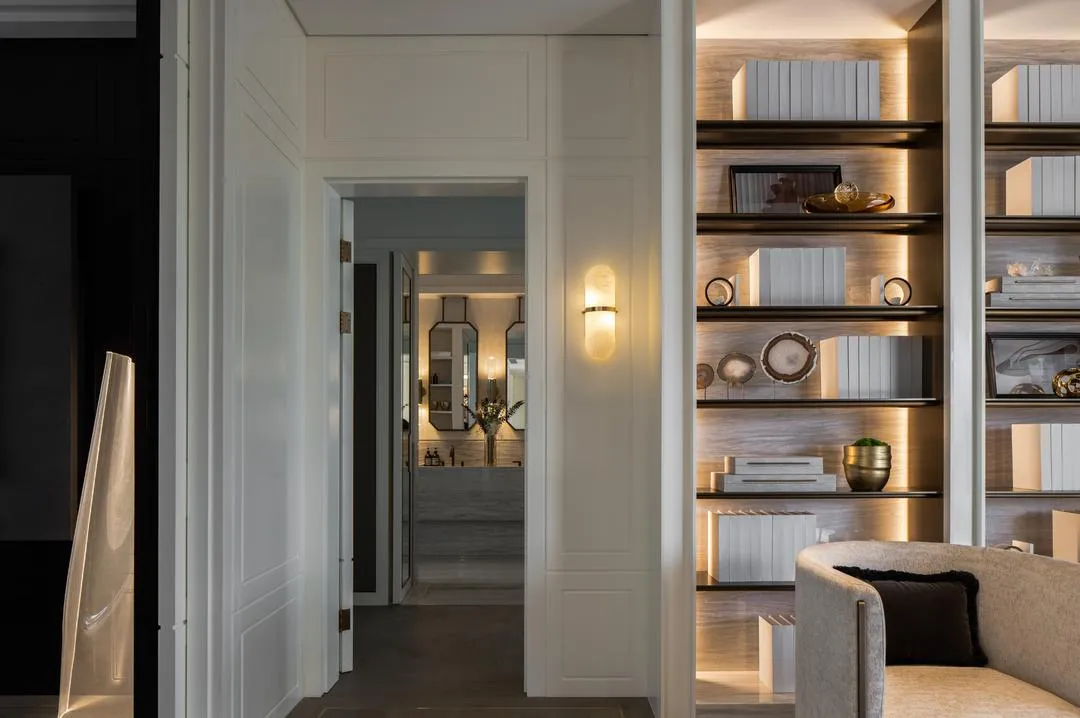 项目营造150米*7米的阔尺门界,遴选马达加斯加蓝翡翠奢石乌克兰幻影石材上墙,约100㎡的奢石界面迎宾,高定归家礼序,绽放生活艺术风采。