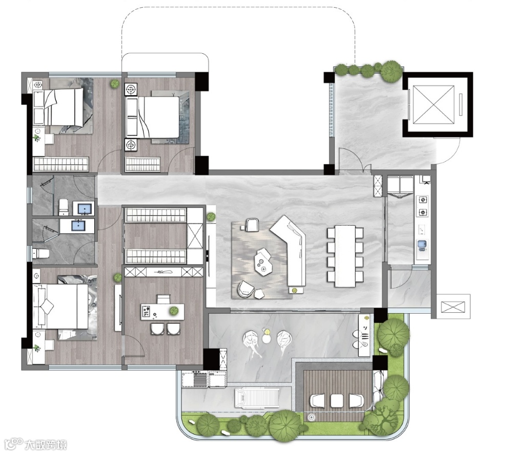 延扩空间的边界,让生活盛开于山河之中。以长河印院143㎡户型为例,在产品设计语言上,更加强调“获得感、尊崇感、多元化”,五个院子空间创造藏品级别墅生活体验。