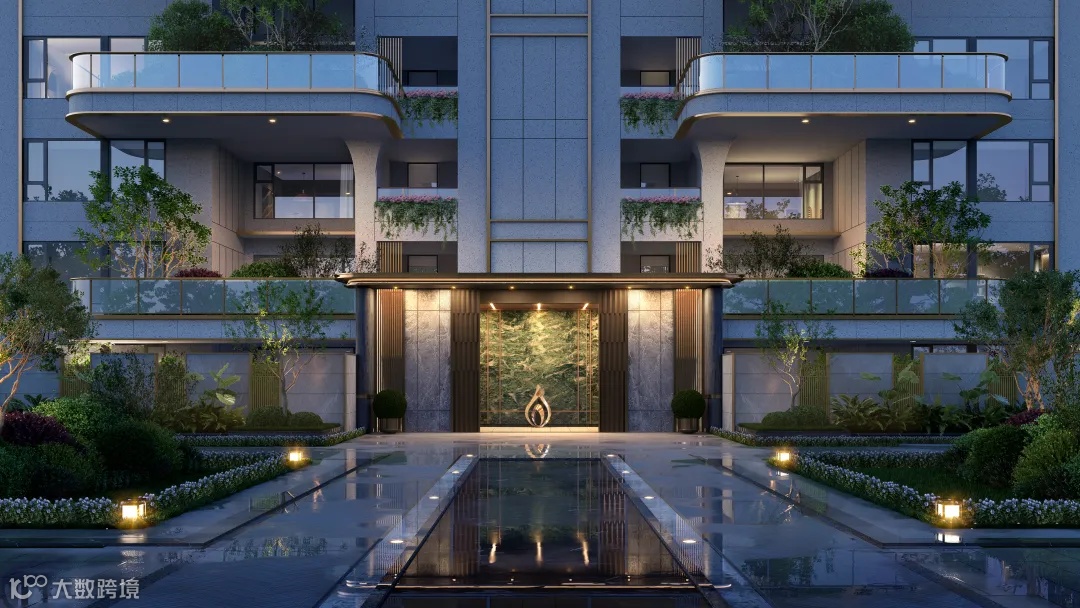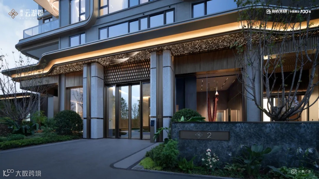 楼栋门厅也更现代流畅,金属格栅与蚀刻的大象灰石材从底至顶拉出竖向线条,大象灰石材圆弧导角在大门两边卓立,恰似数字11。