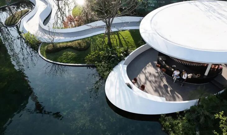示范区设计把莫奈花园、水镜石砌、乌桕林、白玉兰等元素,高度凝练在咫尺空间中;利用光影与角度,展示出整片玉兰花瓣墙厚重与内敛的视觉效果;桕树排布的树阵,与水景融合,形成曲水林霞;以自然为核心,打造隐秘安逸的城芯“世外桃源”。
