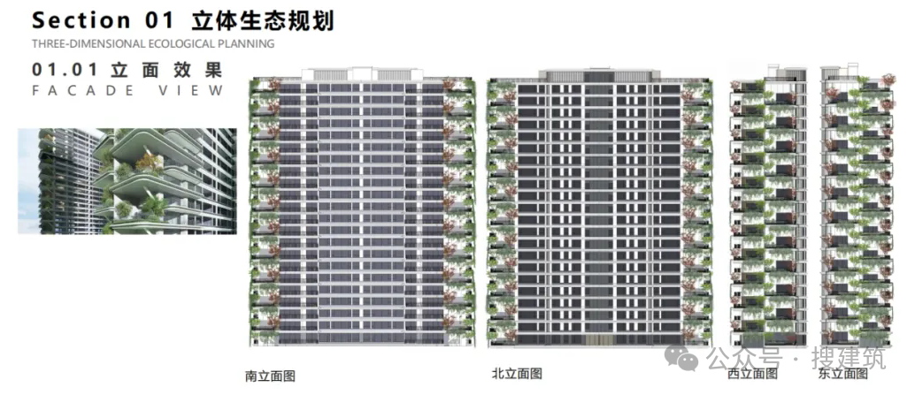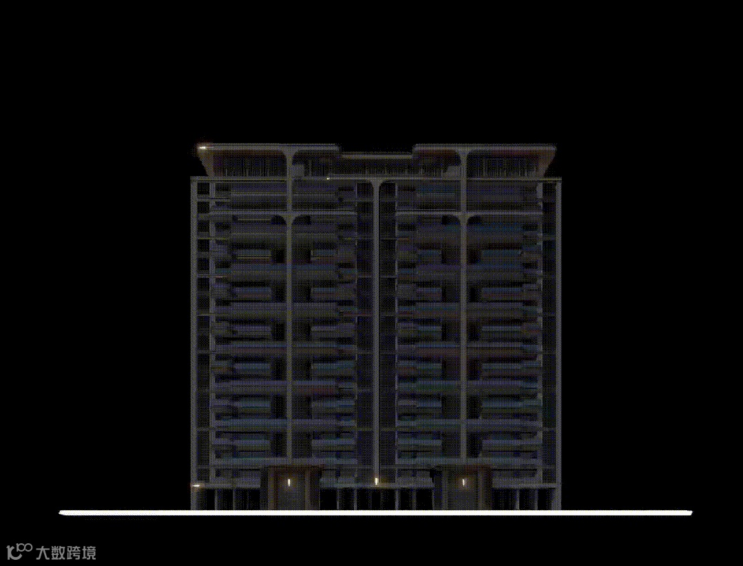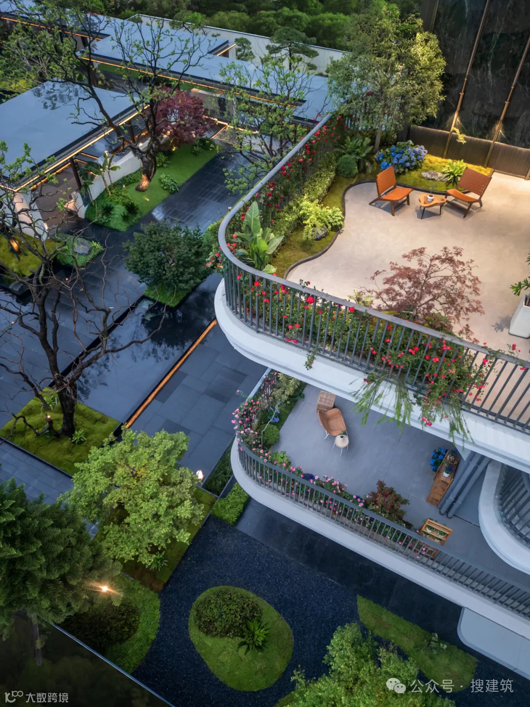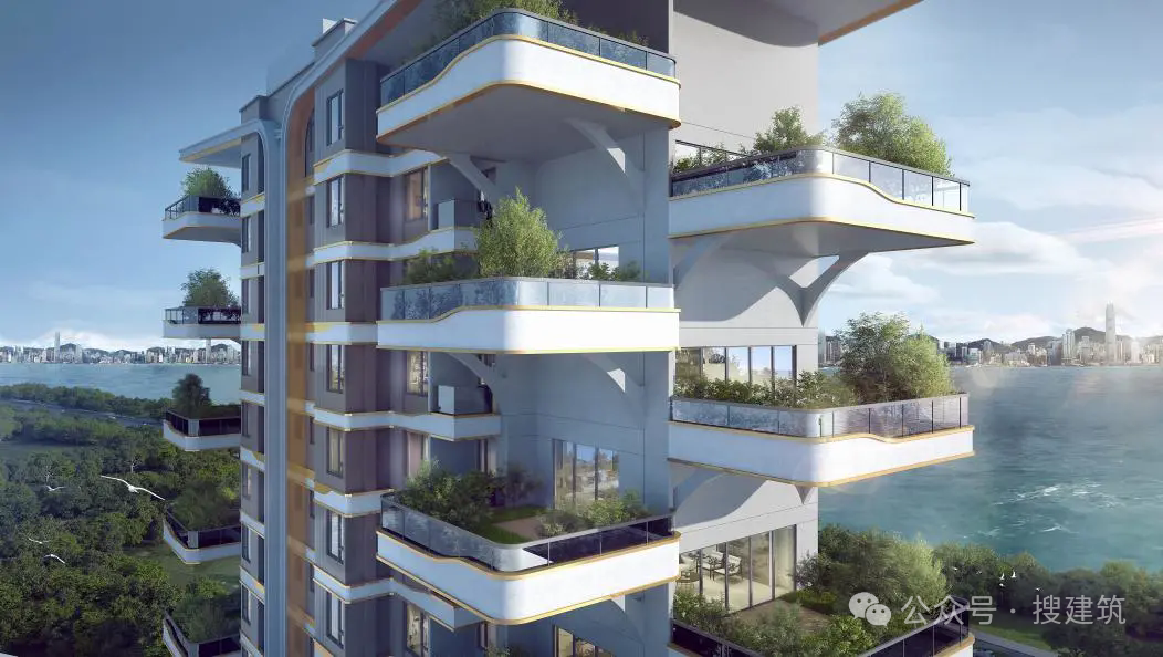 设计回归传统人居理念,利用270°环绕景观打造错层全景露台,奇偶层露台错位,形成通高院落及多维度的城市上空森野谧境。露台通过使用弧形精工化建筑线条及通透天幕玻璃立面,增加建筑的流畅感和未来感,打造奥体片区独特IP标杆形象。