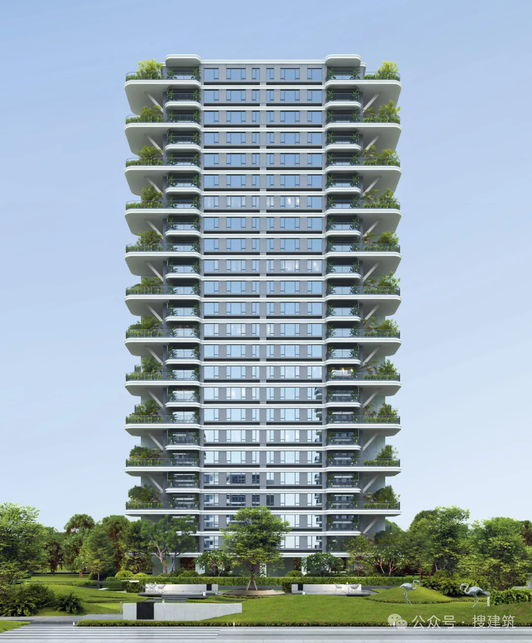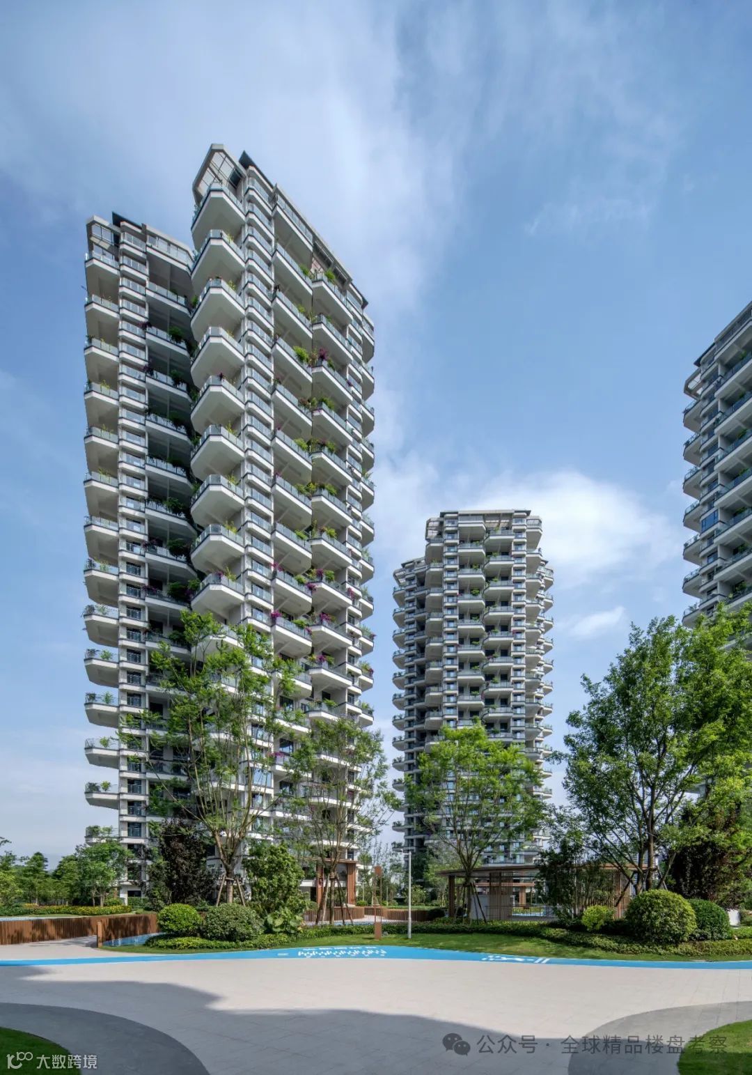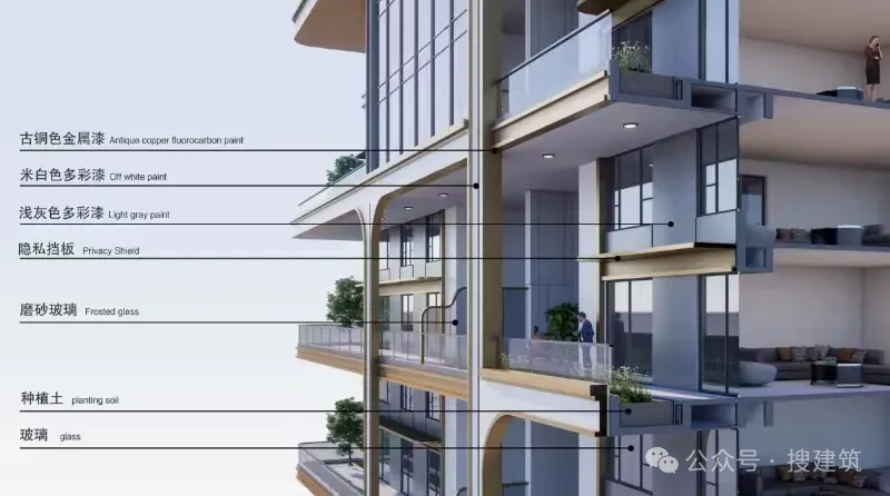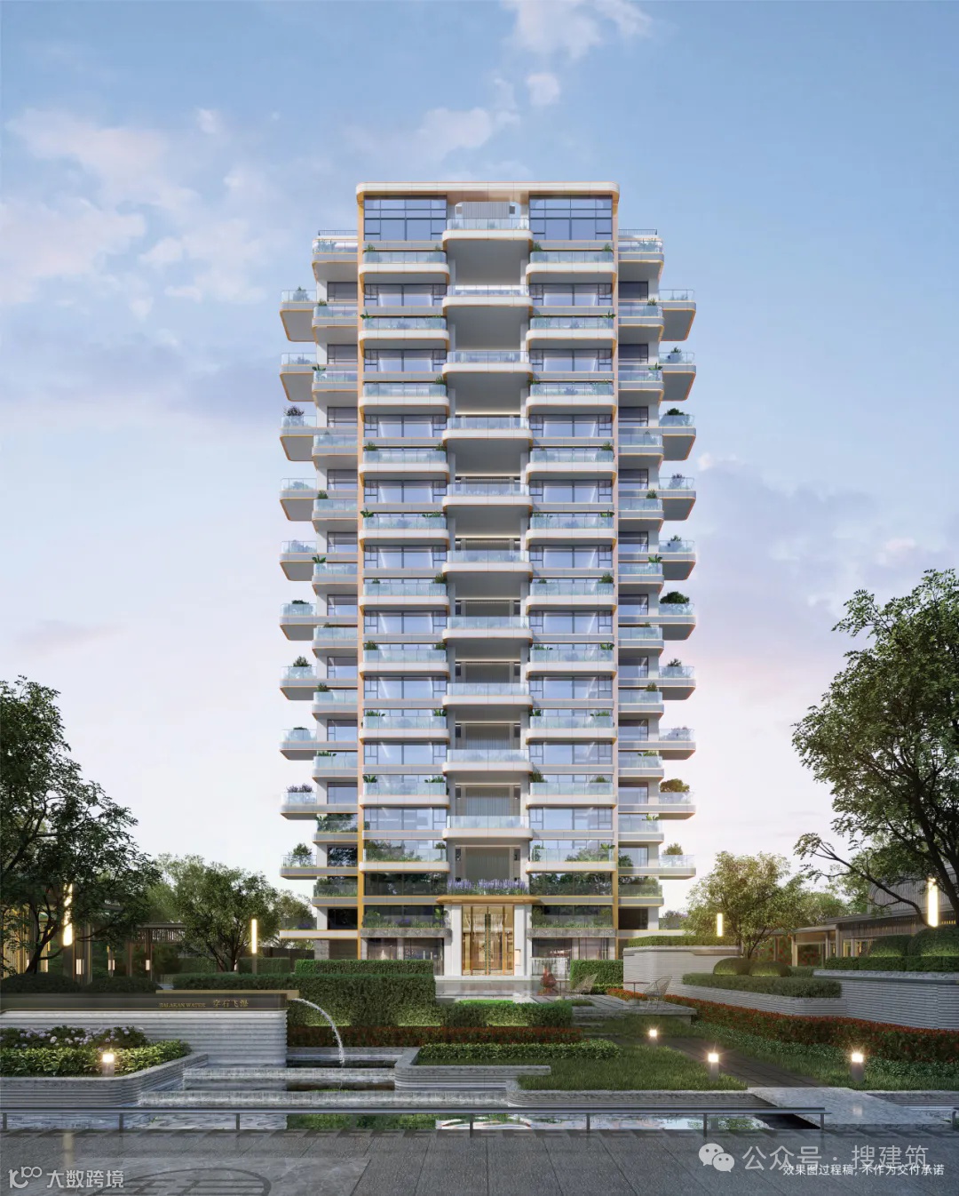 立面设计采取元素符号景观提取转译,将景观元素应用于立面高层大线条处,通过再设计实现丰富观感;将古建元素应用于高层转角阳台,通过弧面玻璃反射效果,形成兼具传统美学与文艺美学特征的立面形象,影显项目的独特性和尊贵感。建筑长出森境,自然包裹立面,层层叠翠,筑就一座会呼吸的城市“森林”。