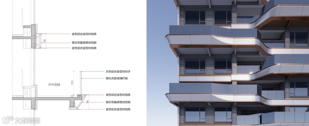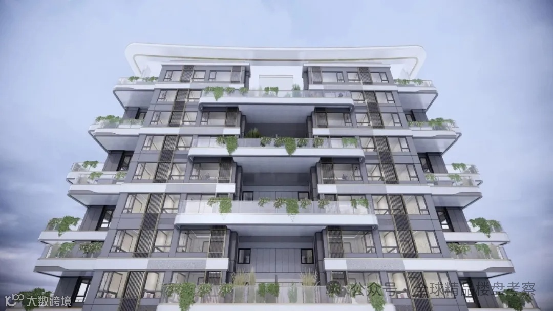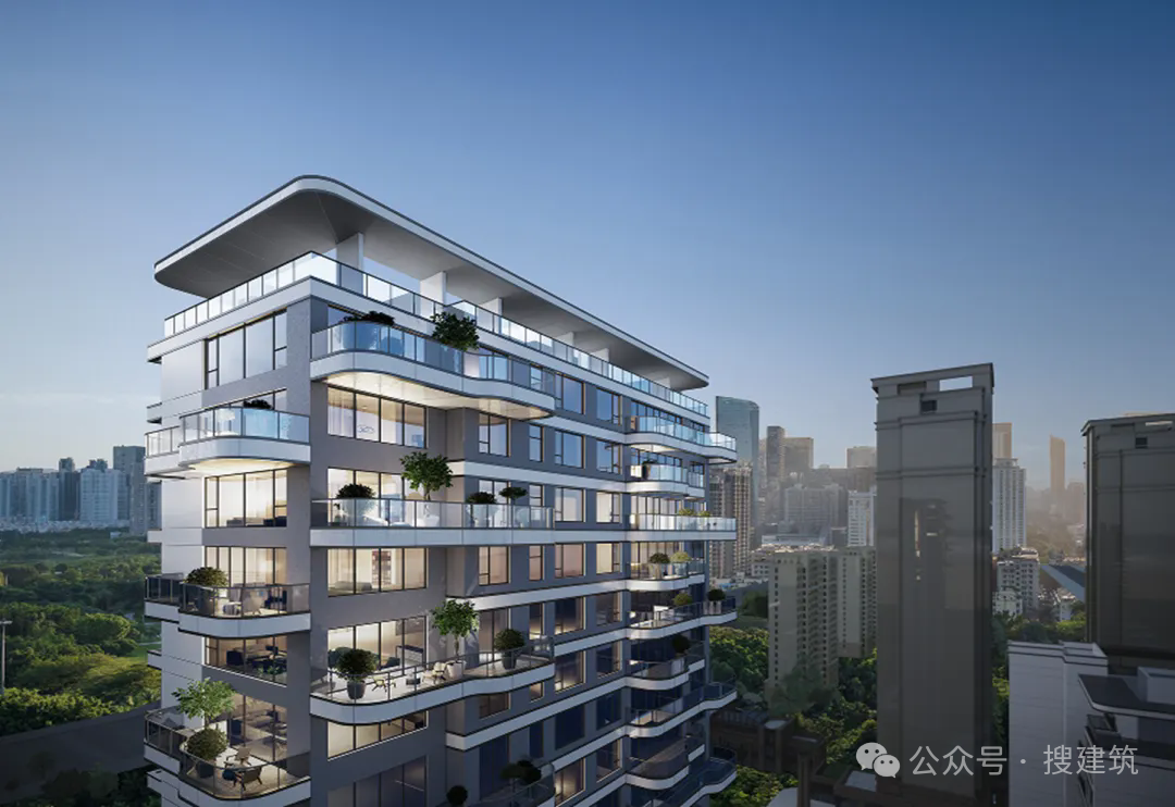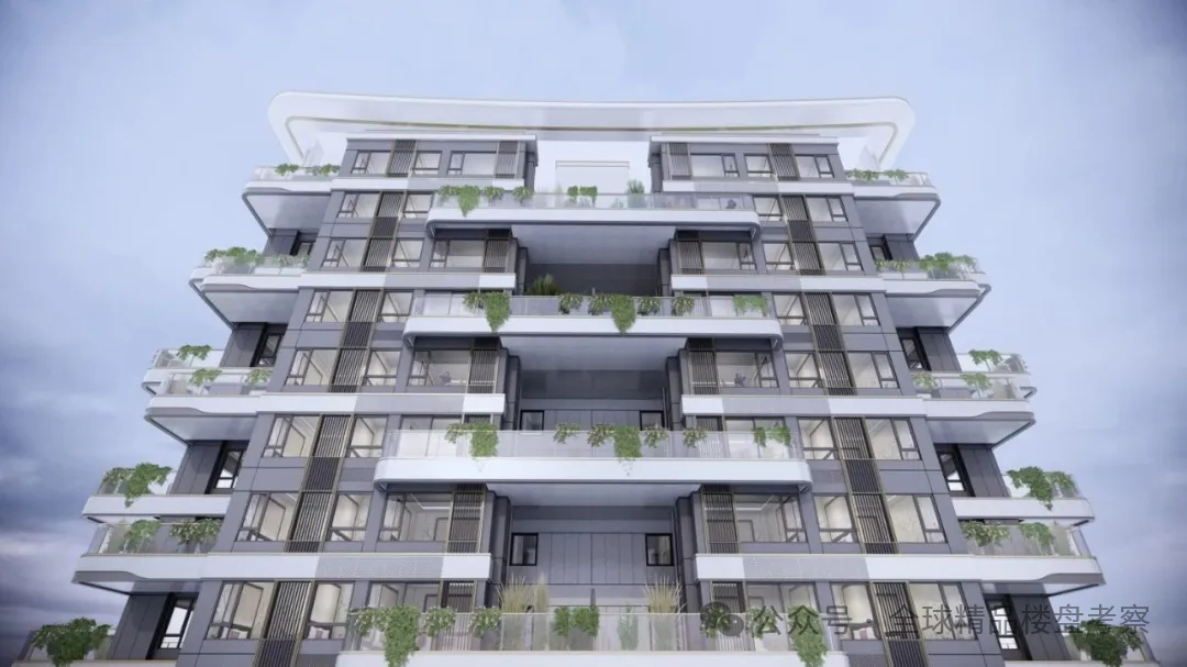 整体建筑形体采用极简的设计语言,强调舒展的横线线条,运用了转角、切割、圆弧等复杂的程序,颠覆传统住宅立面的平铺直叙,玻璃、曲线铝板线条组成灵动的转角阳台,在统一的序列中寻找自然的律动与和谐。