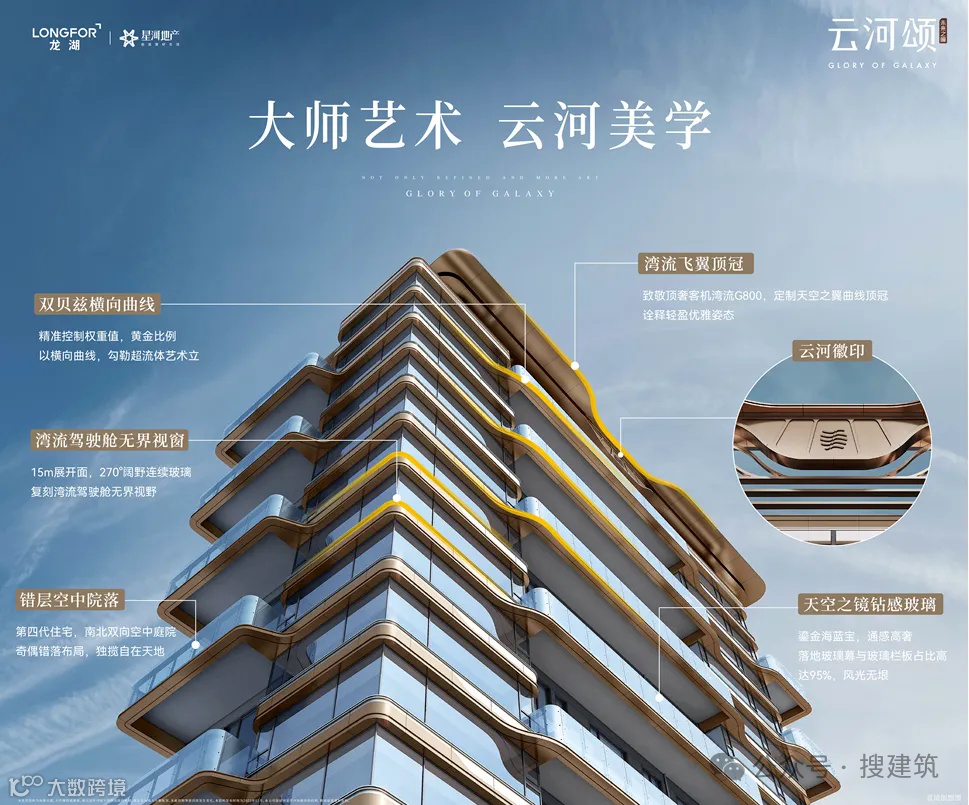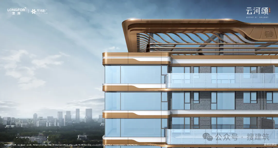 原河云墅,外立面从永恒的太空汲取灵感,选择飞船空间舱体流线美学设计,为匹配这种美学设计,选用金属铝板、仿石无机立体饰面、LOW-E玻璃,构建更先锋的流光立面,成就永恒的建筑地标。