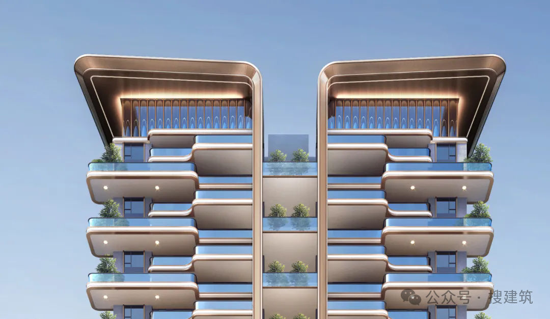 项目立面强调整体造型树形生长之意,使得建筑整体更加灵动写意。在基础上又将立面竖向造型线脚结合分户墙简化,在营造树形自下而上生长的同时也注意避免对住户在空中花园的居住体验。简单几笔树干树枝的勾勒也更显简奢大气。